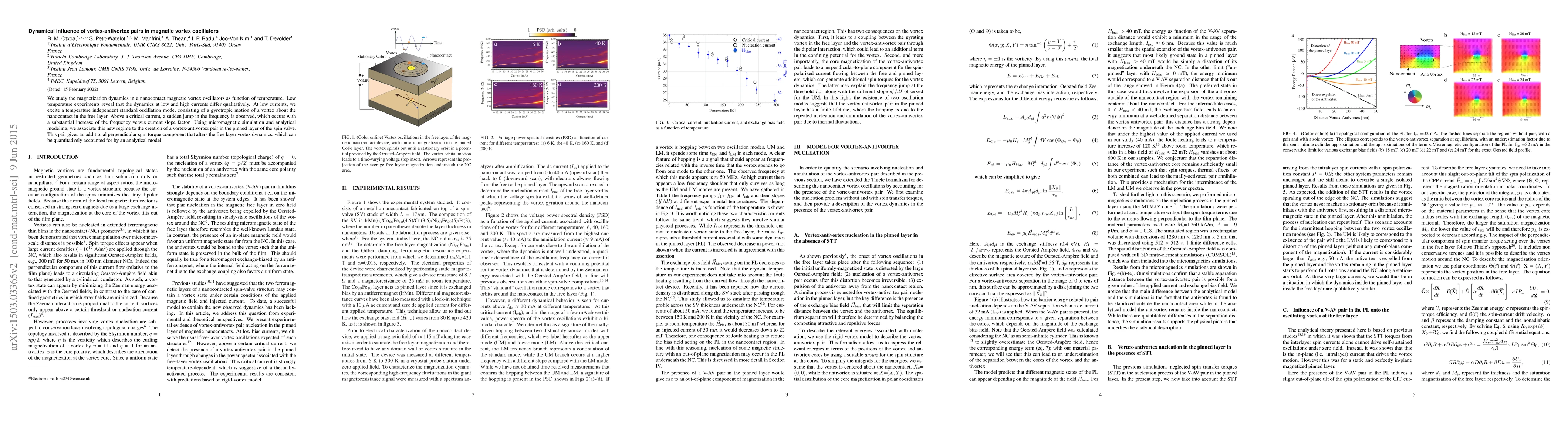 We study the magnetization dynamics in a nanocontact magnetic vortex oscillators as function of temperature. Low temperature experiments reveal that the dynamics at low and high currents differ qualitatively. At low currents, we excite a temperature independent standard oscillation mode, consisting in the gyrotropic motion of a free layer vortex about the nanocontact. Above a critical current, a sudden jump of the frequency is observed, concomitant with a substantial increase of the frequency versus current slope factor. Using micromagnetic simulation and analytical modeling, we associate this new regime to the creation of a vortex-antivortex pair in the pinned layer of the spin valve. The vortex-antivortex distance depends on the Oersted field which favors a separation, and on the exchange bias field, which favors pair merging. The pair in the pinned layer provides an additional spin torque altering the dynamics of the free layer vortex, which can be quantitatively accounted for by an analytical model.