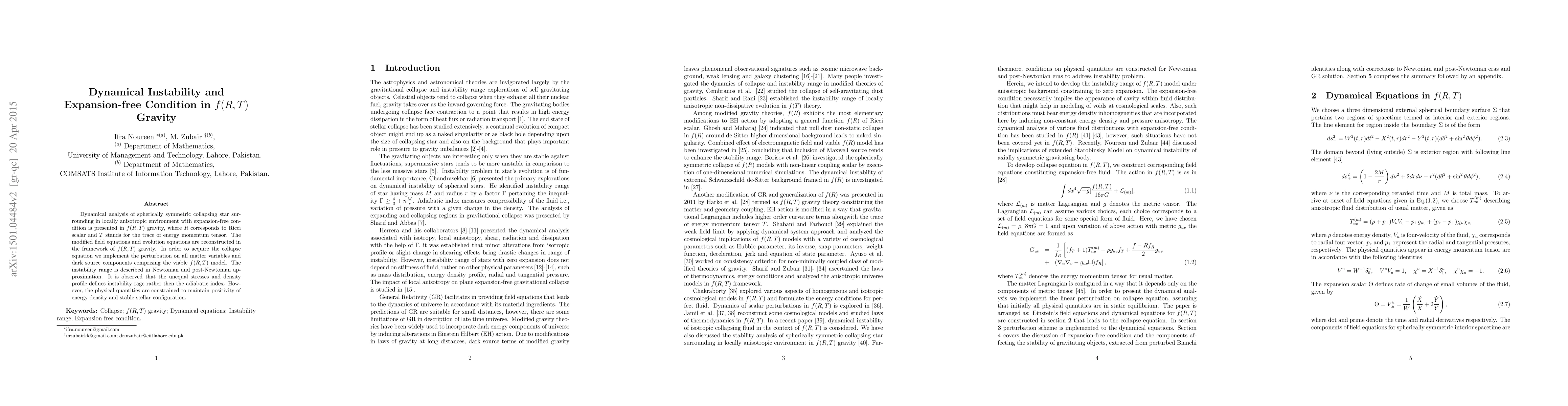 Dynamical analysis of spherically symmetric collapsing star surrounding in locally anisotropic environment with expansion-free condition is presented in $f(R,T)$ gravity, where $R$ corresponds to Ricci scalar and $T$ stands for the trace of energy momentum tensor. The modified field equations and evolution equations are reconstructed in the framework of $f(R,T)$ gravty. In order to acquire the collapse equation we implement the perturbation on all matter variables and dark source components comprising the viable $f(R,T)$ model. The instability range is described in Newtonian and post-Newtonian eras by constraining the adiabatic index $\Gamma$ to maintain viability of considered model and stable stellar configuration.