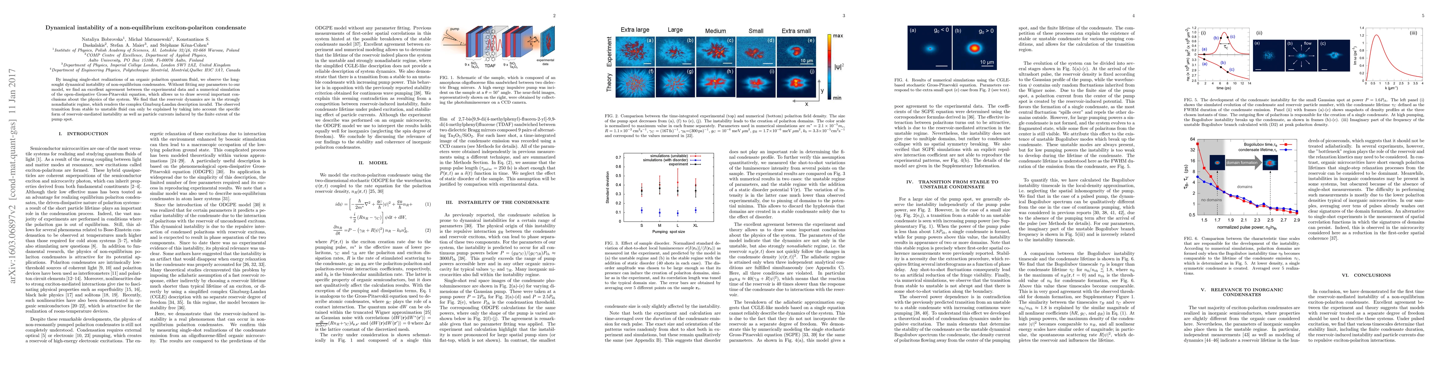 By imaging single-shot realizations of an organic polariton quantum fluid, we observe the long-sought dynamical instability of non-equilibrium condensates. Without any free parameters, we find an excellent agreement between the experimental data and a numerical simulation of the open-dissipative Gross-Pitaevskii equation, which allows us to draw several important conclusions about the physics of the system. We find that the reservoir dynamics are in the strongly nonadiabatic regime, which renders the complex Ginzburg-Landau description invalid. The observed transition from stable to unstable fluid can only be explained by taking into account the specific form of reservoir-mediated instability as well as particle currents induced by the finite extent of the pump spot.