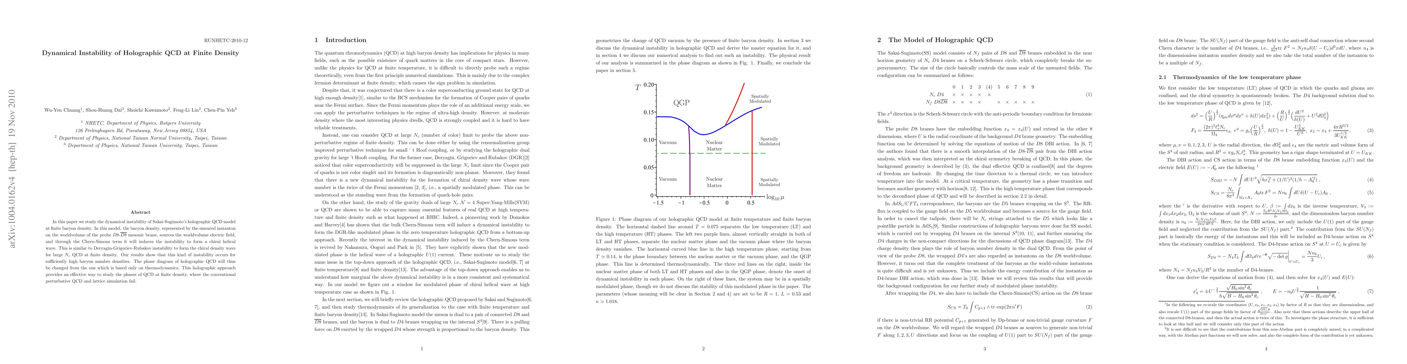 This paper investigates the dynamical instability in Sakai-Sugimoto's holographic QCD model at finite baryon density, demonstrating the formation of chiral helical waves due to the Chern-Simons term. This instability occurs at high baryon densities, altering the phase diagram of holographic QCD and providing an effective method to study QCD phases where traditional methods fail.