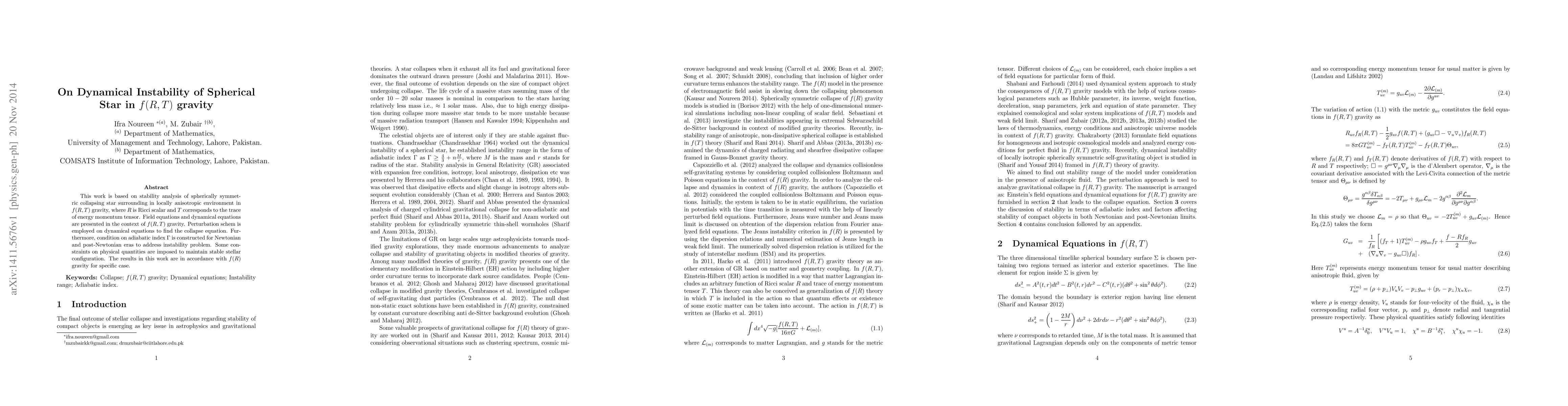 This paper analyzes the dynamical instability of a spherical star in $f(R,T)$ gravity, examining the stability of a collapsing star in a locally anisotropic environment. It uses perturbation schemes to derive collapse equations and determines conditions for instability, concluding that stability can be maintained under certain constraints on physical quantities.