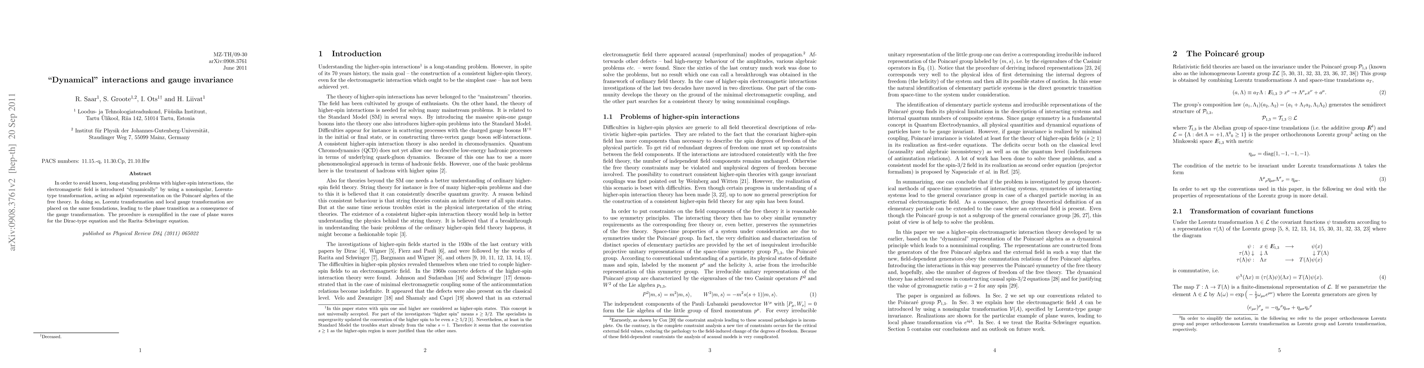 Appreciating the classical understanding of the elementary particle the "dynamical" Poincare algebra is developed. It is shown that the "dynamical" Poincare algebra and the equations of motion of particles with arbitrary spin are gauge invariant and that gauge invariance and relativistic invariance stand on equal footings. A "dynamical" non-minimal interaction is constructed explicitly and the Rarita-Schwinger equation is considered in the framework of this "dynamical" interaction.