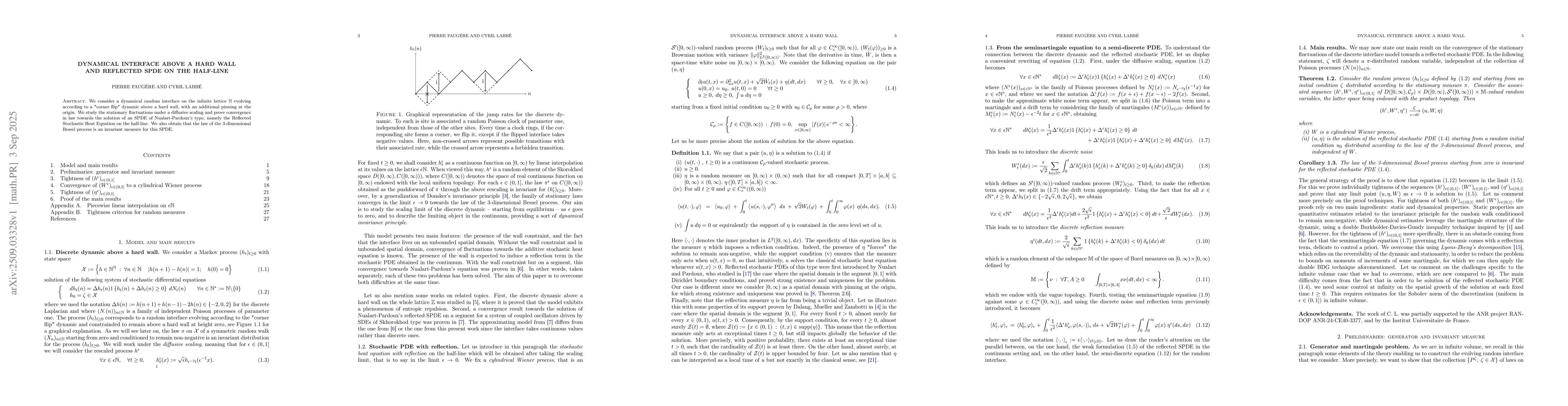 We consider a dynamical random interface on the infinite lattice $\mathbb{N}$ evolving according to a "corner flip" dynamic above a hard wall, with an additional pinning at the origin. We study the stationary fluctuations under a diffusive scaling and prove convergence in law towards the solution of an SPDE of Nualart-Pardoux's type, namely the Reflected Stochastic Heat Equation on the half-line. We also obtain that the law of the 3-dimensional Bessel process is an invariant measure for this SPDE.