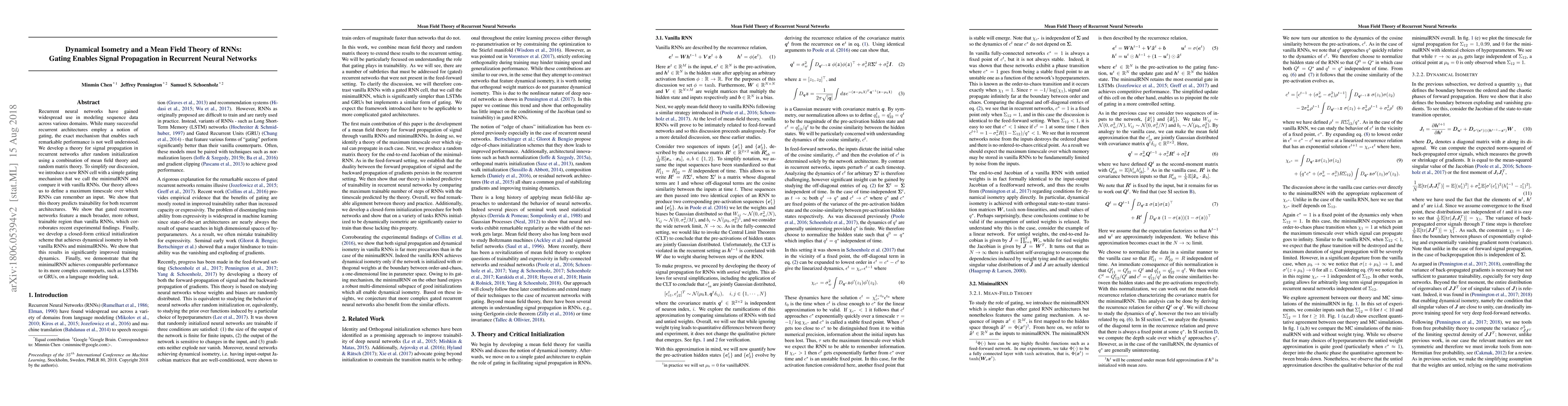 Recurrent neural networks have gained widespread use in modeling sequence data across various domains. While many successful recurrent architectures employ a notion of gating, the exact mechanism that enables such remarkable performance is not well understood. We develop a theory for signal propagation in recurrent networks after random initialization using a combination of mean field theory and random matrix theory. To simplify our discussion, we introduce a new RNN cell with a simple gating mechanism that we call the minimalRNN and compare it with vanilla RNNs. Our theory allows us to define a maximum timescale over which RNNs can remember an input. We show that this theory predicts trainability for both recurrent architectures. We show that gated recurrent networks feature a much broader, more robust, trainable region than vanilla RNNs, which corroborates recent experimental findings. Finally, we develop a closed-form critical initialization scheme that achieves dynamical isometry in both vanilla RNNs and minimalRNNs. We show that this results in significantly improvement in training dynamics. Finally, we demonstrate that the minimalRNN achieves comparable performance to its more complex counterparts, such as LSTMs or GRUs, on a language modeling task.