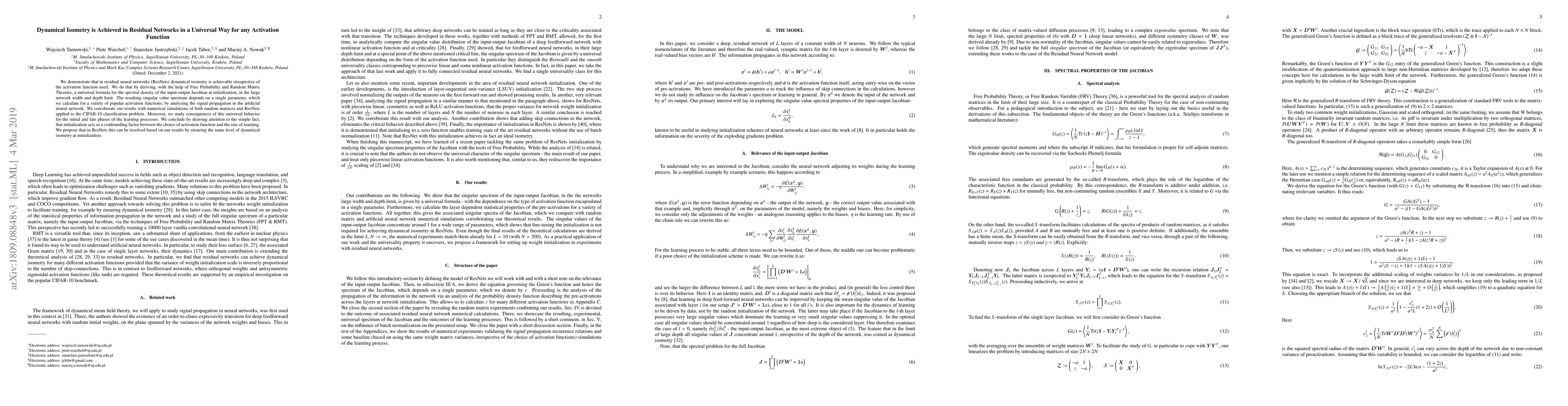 We demonstrate that in residual neural networks (ResNets) dynamical isometry is achievable irrespectively of the activation function used. We do that by deriving, with the help of Free Probability and Random Matrix Theories, a universal formula for the spectral density of the input-output Jacobian at initialization, in the large network width and depth limit. The resulting singular value spectrum depends on a single parameter, which we calculate for a variety of popular activation functions, by analyzing the signal propagation in the artificial neural network. We corroborate our results with numerical simulations of both random matrices and ResNets applied to the CIFAR-10 classification problem. Moreover, we study the consequence of this universal behavior for the initial and late phases of the learning processes. We conclude by drawing attention to the simple fact, that initialization acts as a confounding factor between the choice of activation function and the rate of learning. We propose that in ResNets this can be resolved based on our results, by ensuring the same level of dynamical isometry at initialization.