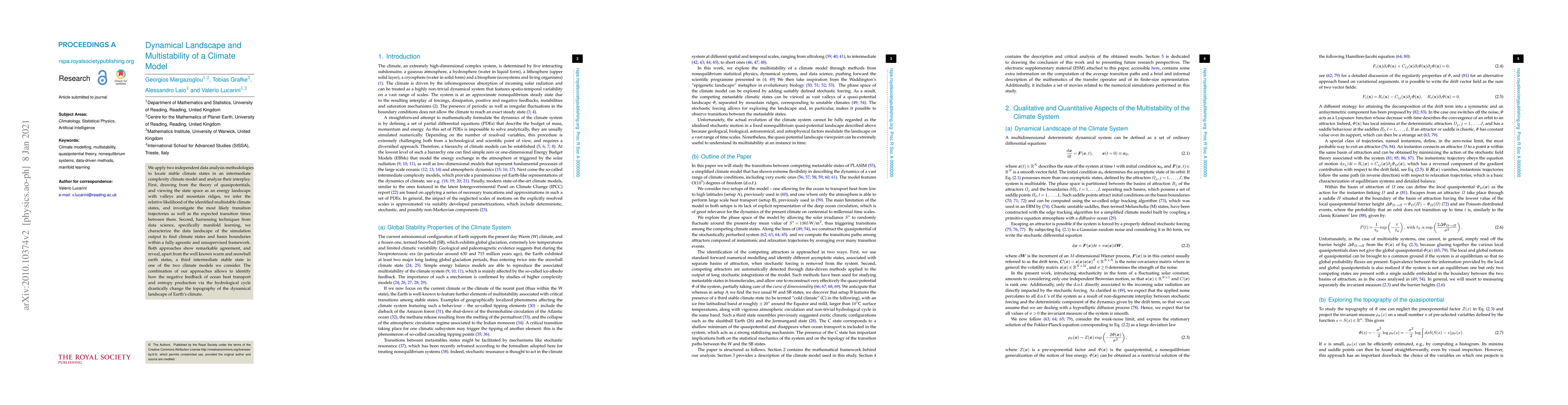 We apply two independent data analysis methodologies to locate stable climate states in an intermediate complexity climate model and analyze their interplay. First, drawing from the theory of quasipotentials, and viewing the state space as an energy landscape with valleys and mountain ridges, we infer the relative likelihood of the identified multistable climate states, and investigate the most likely transition trajectories as well as the expected transition times between them. Second, harnessing techniques from data science, specifically manifold learning, we characterize the data landscape of the simulation output to find climate states and basin boundaries within a fully agnostic and unsupervised framework. Both approaches show remarkable agreement, and reveal, apart from the well known warm and snowball earth states, a third intermediate stable state in one of the two climate models we consider. The combination of our approaches allows to identify how the negative feedback of ocean heat transport and entropy production via the hydrological cycle drastically change the topography of the dynamical landscape of Earth's climate.