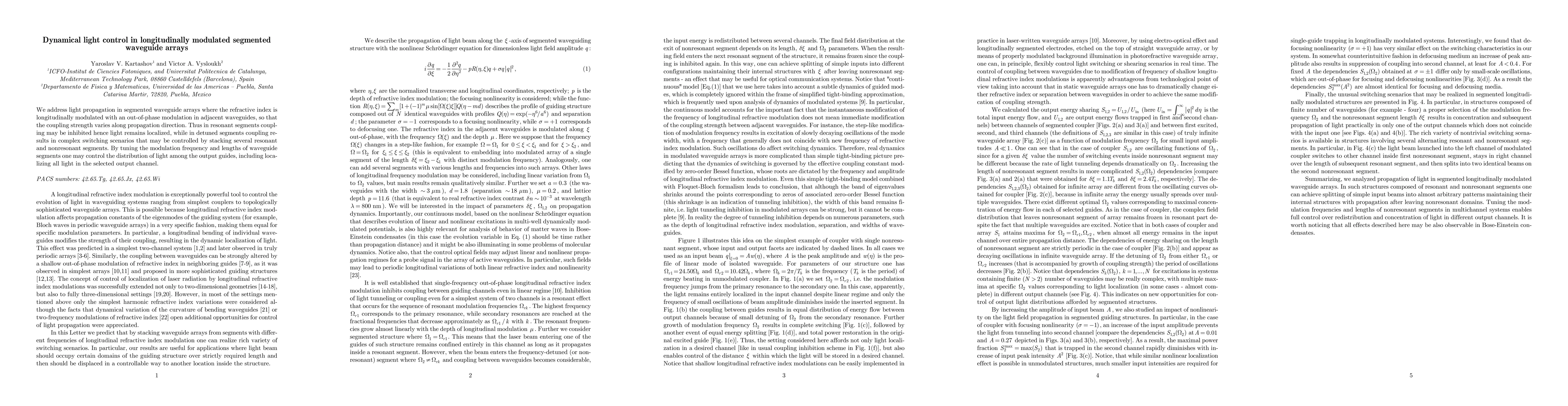 This paper explores light propagation in segmented waveguide arrays with longitudinally modulated refractive indices, demonstrating how varying coupling strength along the propagation direction can localize light or enable complex switching scenarios. By adjusting modulation frequency and segment lengths, researchers can control the distribution of light among output channels, including directing all light to a selected output.