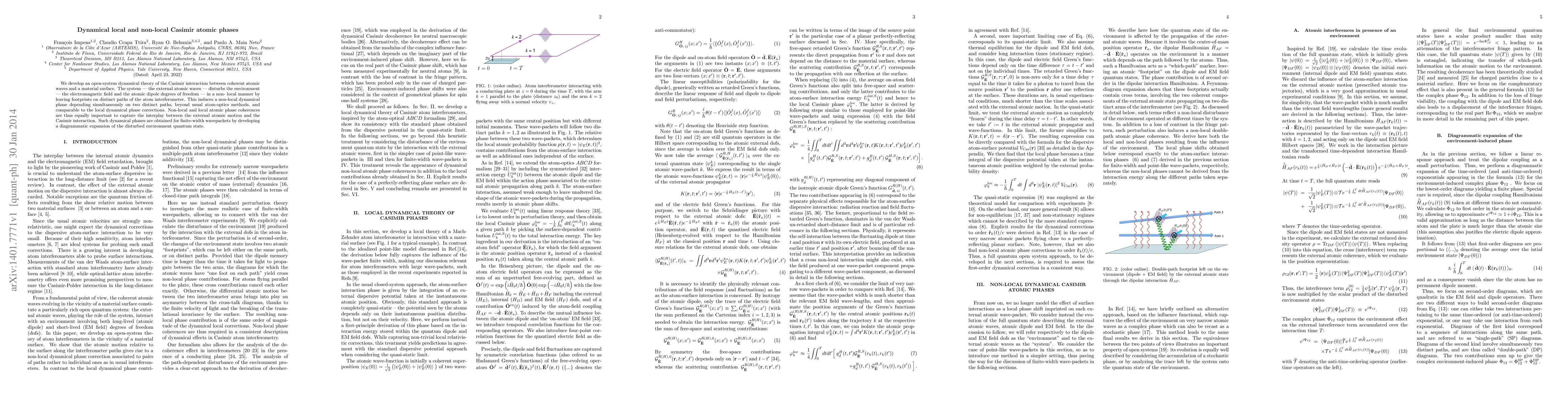We develop an open-system dynamical theory of the Casimir interaction between coherent atomic waves and a material surface. The system --- the external atomic waves --- disturbs the environment --- the electromagnetic field and the atomic dipole degrees of freedom --- in a non- local manner by leaving footprints on distinct paths of the atom interferometer. This induces a non-local dynamical phase depending simultaneously on two distinct paths, beyond usual atom-optics methods, and comparable to the local dynamical phase corrections. Non-local and local atomic phase coherences are thus equally important to capture the interplay between the external atomic motion and the Casimir interaction. Such dynamical phases are obtained for finite-width wavepackets by developing a diagrammatic expansion of the disturbed environment quantum state.