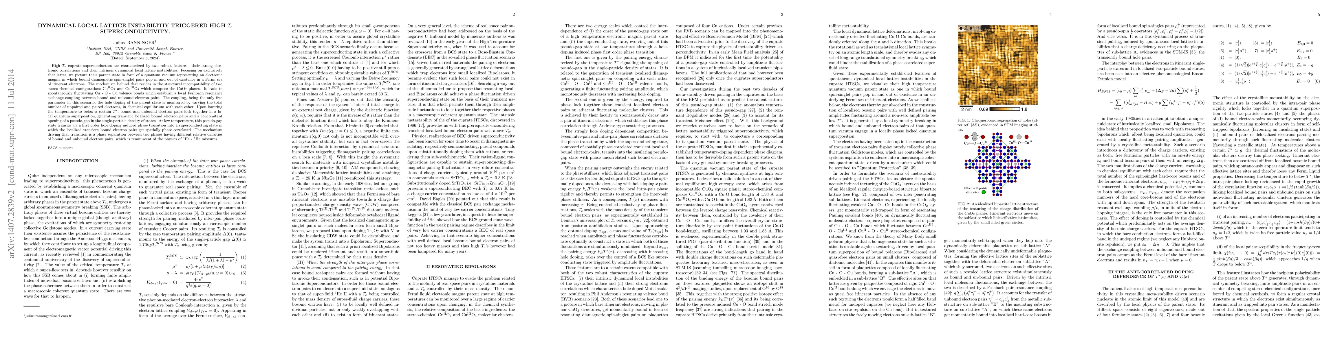 This paper explores high $T_c$ superconductivity in cuprate materials, attributing it to intrinsic dynamical local lattice instabilities. The mechanism involves fluctuating Cu-O-Cu valence bonds leading to a phase transition into superconductivity via a pseudo-gap state and phase separation.