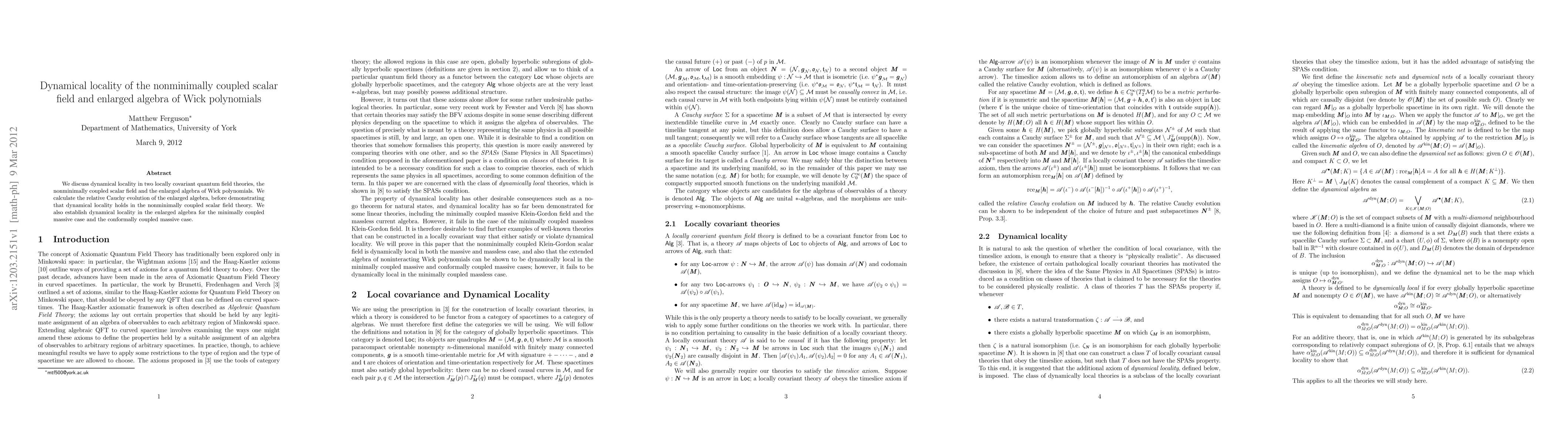 This paper explores dynamical locality in nonminimally coupled scalar field theory and an enlarged algebra of Wick polynomials, proving that dynamical locality holds in both cases for specific coupling scenarios.
