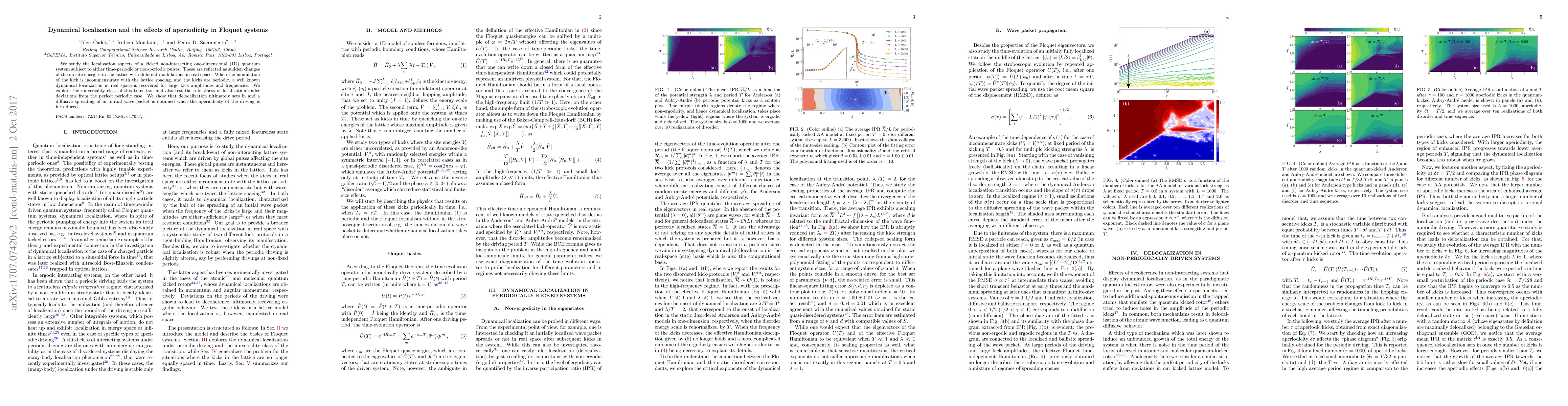 We study the localization aspects of a kicked non-interacting one-dimensional (1D) quantum system subject to either time-periodic or non-periodic pulses. These are reflected as sudden changes of the onsite energies in the lattice with different modulations in real space. When the modulation of the kick is incommensurate with the lattice spacing, and the kicks are periodic, a well known dynamical localization in real space is recovered for large kick amplitudes and frequencies. We explore the universality class of this transition and also test the robustness of localization under deviations from the perfect periodic case. We show that delocalization ultimately sets in and a diffusive spreading of an initial wave packet is obtained when the aperiodicity of the driving is introduced.