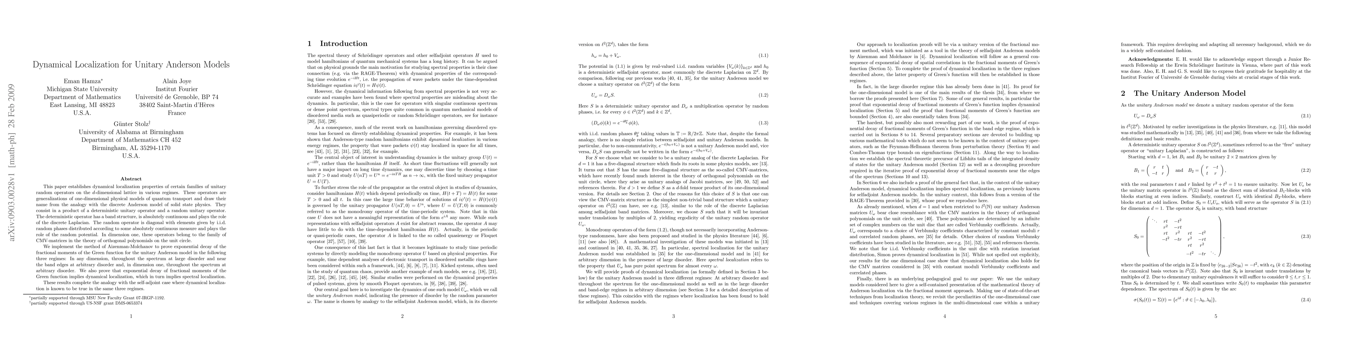 This paper investigates dynamical localization in unitary Anderson models on d-dimensional lattices, proving exponential decay of fractional moments of the Green function in various regimes. The results establish dynamical localization and spectral localization, completing the analogy with the self-adjoint case.