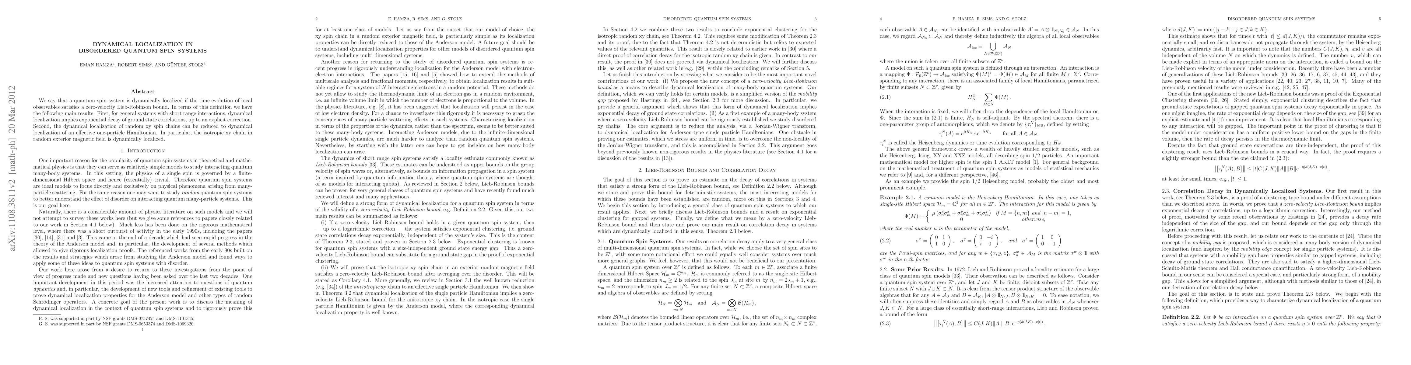 This paper investigates dynamical localization in disordered quantum spin systems, showing that it implies exponential decay of ground state correlations. It also demonstrates that dynamical localization in random xy spin chains can be simplified to an effective one-particle Hamiltonian, with the isotropic xy chain in a random magnetic field being dynamically localized.