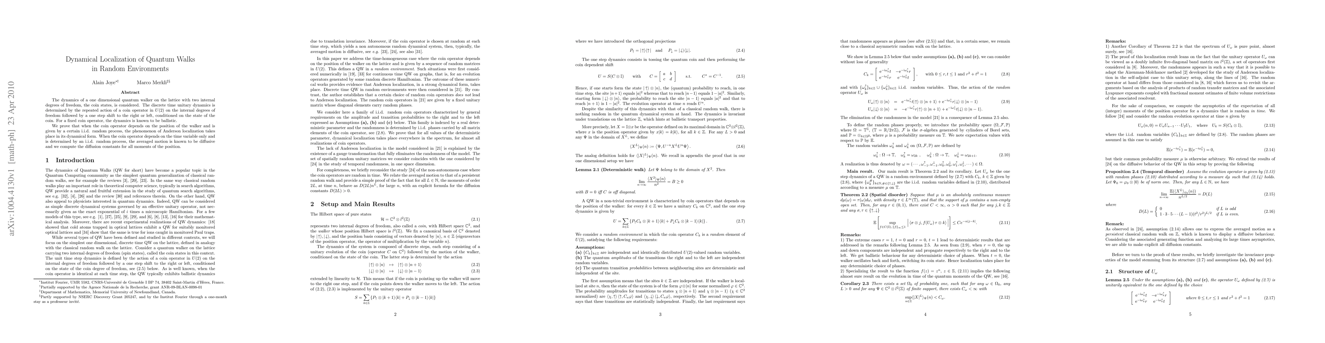 The dynamics of a one dimensional quantum walker on the lattice with two internal degrees of freedom, the coin states, is considered. The discrete time unitary dynamics is determined by the repeated action of a coin operator in U(2) on the internal degrees of freedom followed by a one step shift to the right or left, conditioned on the state of the coin. For a fixed coin operator, the dynamics is known to be ballistic. We prove that when the coin operator depends on the position of the walker and is given by a certain i.i.d. random process, the phenomenon of Anderson localization takes place in its dynamical form. When the coin operator depends on the time variable only and is determined by an i.i.d. random process, the averaged motion is known to be diffusive and we compute the diffusion constants for all moments of the position.