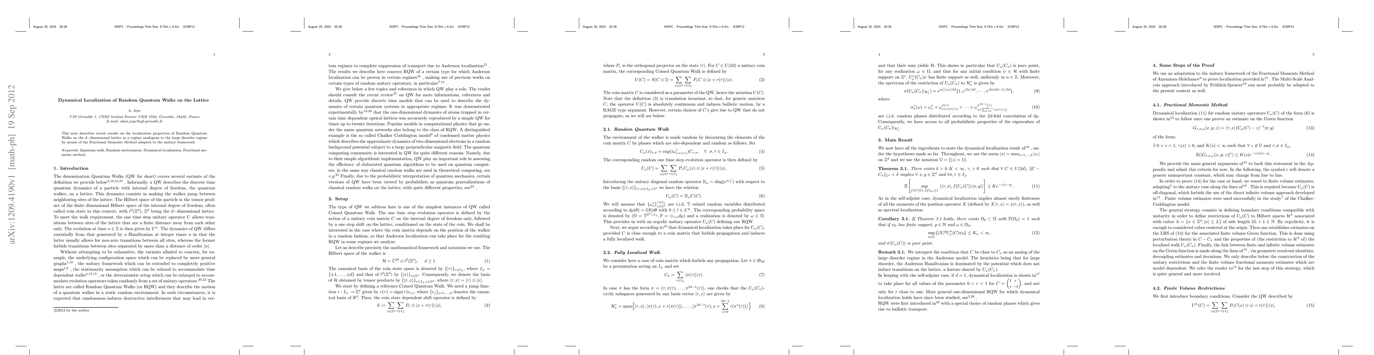 Summary: This paper investigates the dynamical localization of random quantum walks on d-dimensional lattices using the Fractional Moments Method, revealing localization properties akin to those seen in large disorder regimes. The study adapts this method to the unitary framework for analysis.