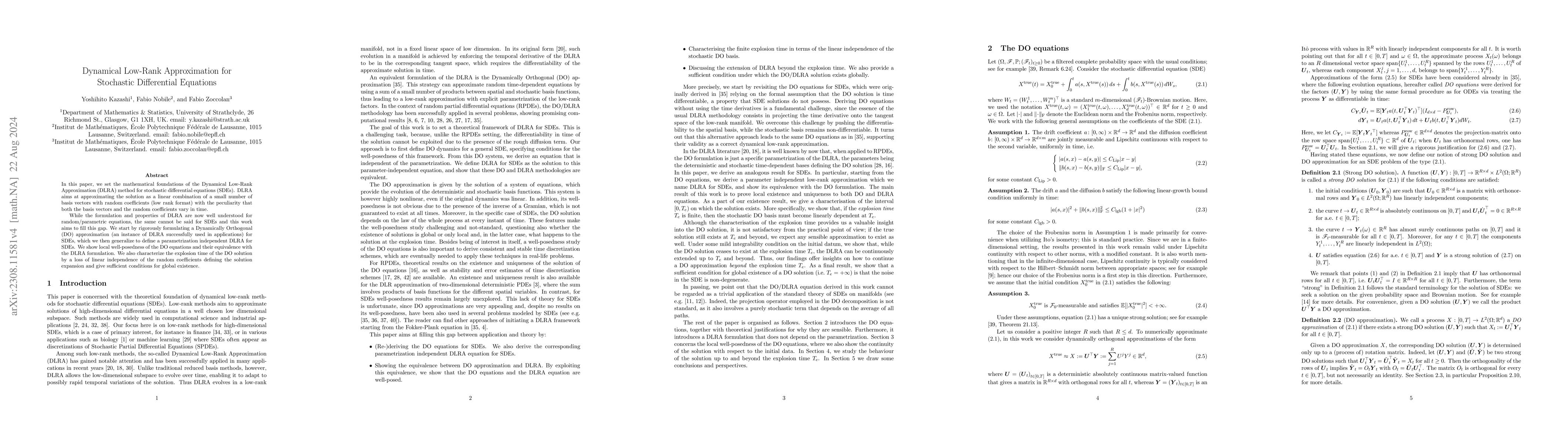 This paper develops the Dynamical Low-Rank Approximation (DLRA) method for stochastic differential equations (SDEs), formulating a Dynamically Orthogonal (DO) approximation and proving local well-posedness, equivalence with DLRA, and conditions for global existence by characterizing the explosion time.
