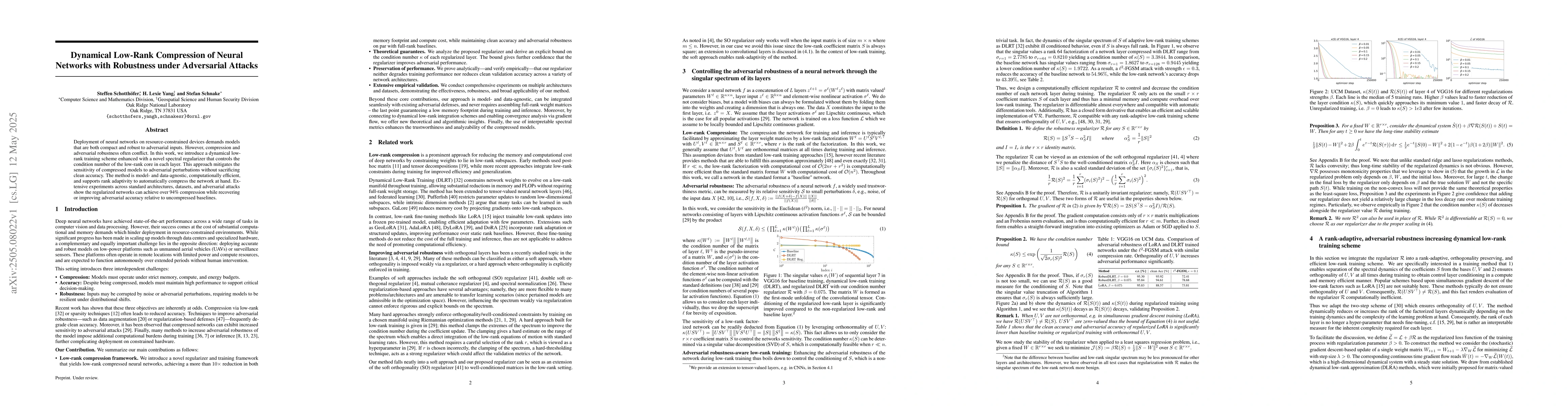 Deployment of neural networks on resource-constrained devices demands models that are both compact and robust to adversarial inputs. However, compression and adversarial robustness often conflict. In this work, we introduce a dynamical low-rank training scheme enhanced with a novel spectral regularizer that controls the condition number of the low-rank core in each layer. This approach mitigates the sensitivity of compressed models to adversarial perturbations without sacrificing clean accuracy. The method is model- and data-agnostic, computationally efficient, and supports rank adaptivity to automatically compress the network at hand. Extensive experiments across standard architectures, datasets, and adversarial attacks show the regularized networks can achieve over 94% compression while recovering or improving adversarial accuracy relative to uncompressed baselines.