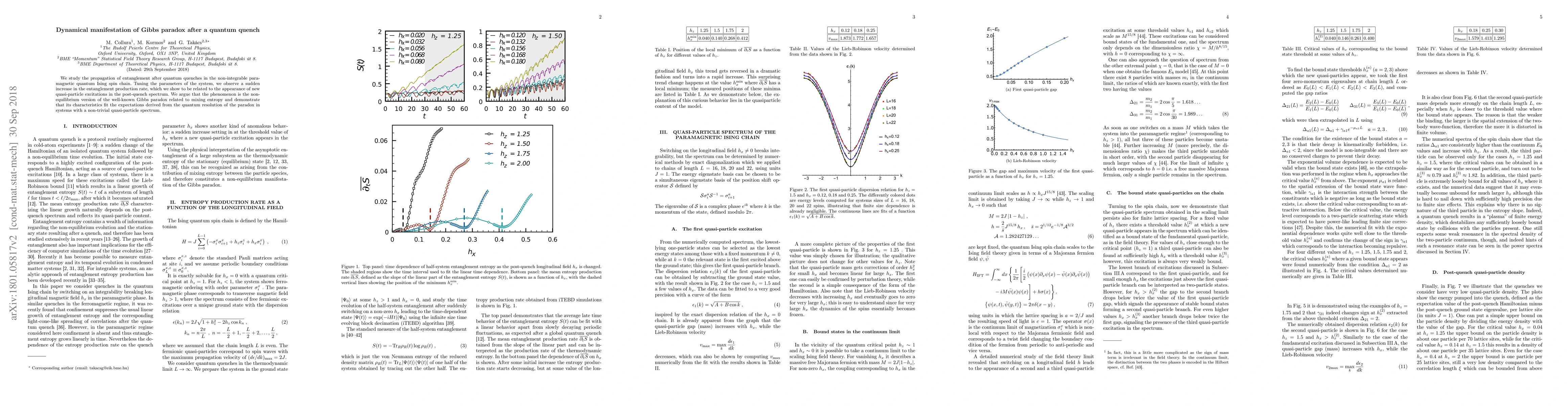 This paper investigates the entanglement dynamics following a quantum quench in a non-integrable para-magnetic quantum Ising spin chain, revealing a sudden surge in entanglement linked to new quasi-particle excitations. The authors connect this phenomenon to the non-equilibrium version of the Gibbs paradox, aligning its features with quantum expectations in systems with complex quasi-particle spectra.
