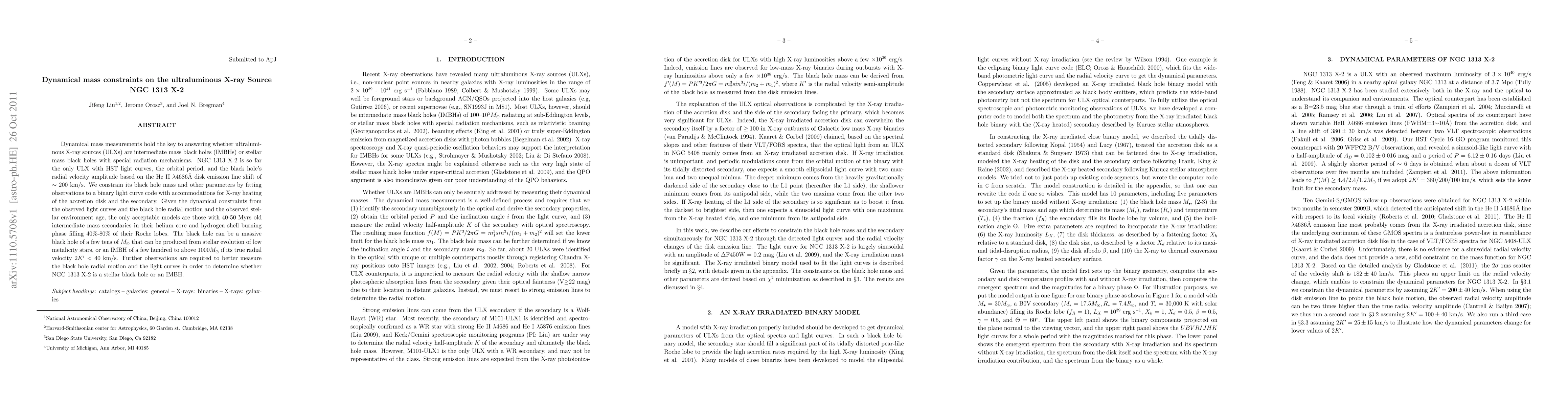 Dynamical mass measurements hold the key to answering whether ultraluminous X-ray sources (ULXs) are intermediate mass black holes (IMBHs) or stellar mass black holes with special radiation mechanisms. NGC 1313 X-2 is so far the only ULX with HST light curves, the orbital period, and the black hole's radial velocity amplitude based on the He II $\lambda4686$\AA\ disk emission line shift of $\sim200$ km/s. We constrain its black hole mass and other parameters by fitting observations to a binary light curve code with accommodations for X-ray heating of the accretion disk and the secondary. Given the dynamical constraints from the observed light curves and the black hole radial motion and the observed stellar environment age, the only acceptable models are those with 40-50 Myrs old intermediate mass secondaries in their helium core and hydrogen shell burning phase filling 40%-80% of their Roche lobes. The black hole can be a massive black hole of a few tens of $M_\odot$ that can be produced from stellar evolution of low metalicity stars, or an IMBH of a few hundred to above 1000$M_\odot$ if its true radial velocity $2K^\prime<40$ km/s. Further observations are required to better measure the black hole radial motion and the light curves in order to determine whether NGC 1313 X-2 is a stellar black hole or an IMBH.