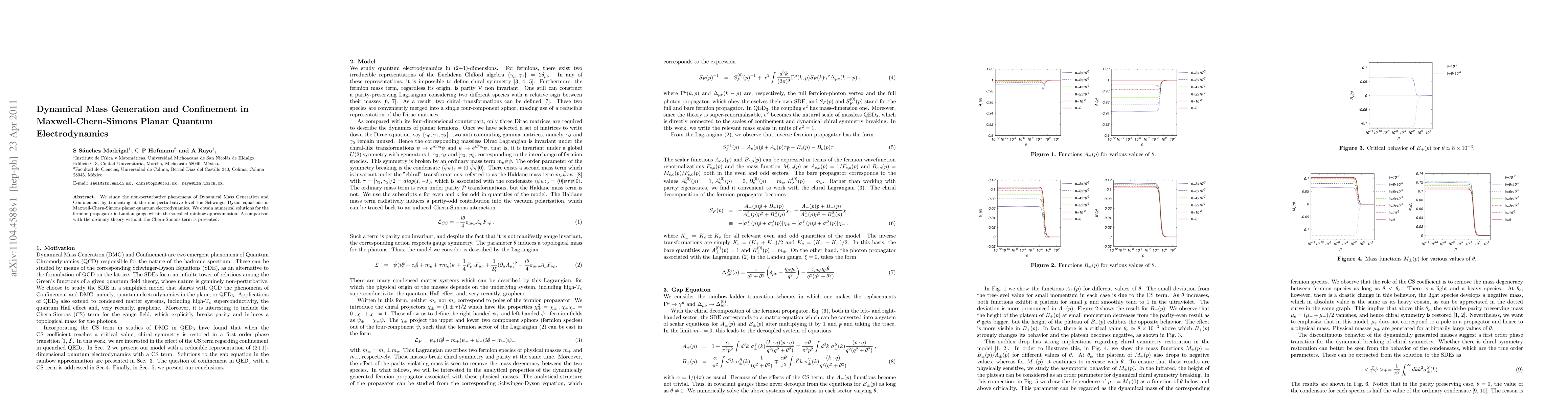 This paper investigates non-perturbative phenomena of dynamical mass generation and confinement in Maxwell-Chern-Simons planar quantum electrodynamics by solving truncated Schwinger-Dyson equations. Numerical results show fermion propagators in Landau gauge under the rainbow approximation, revealing differences compared to the standard theory without the Chern-Simons term.