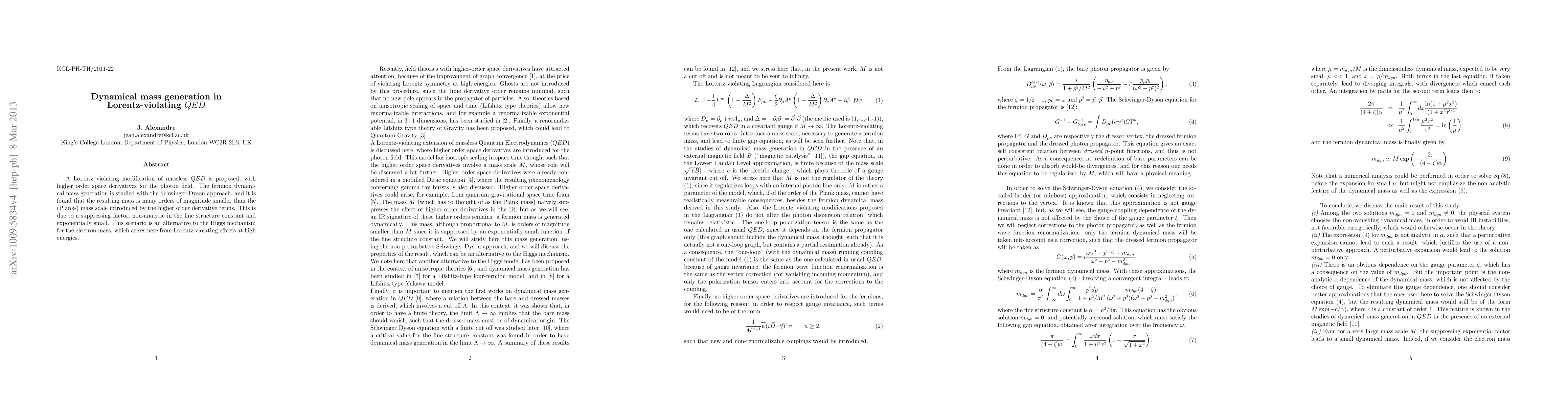 This paper explores a Lorentz-violating variant of massless quantum electrodynamics (QED) with higher-order space derivatives, demonstrating that it can generate a dynamical fermion mass through the Schwinger-Dyson approach. The resulting mass is significantly smaller than the Planck mass scale due to a suppressing factor, suggesting an alternative to the Higgs mechanism for electron mass generation.