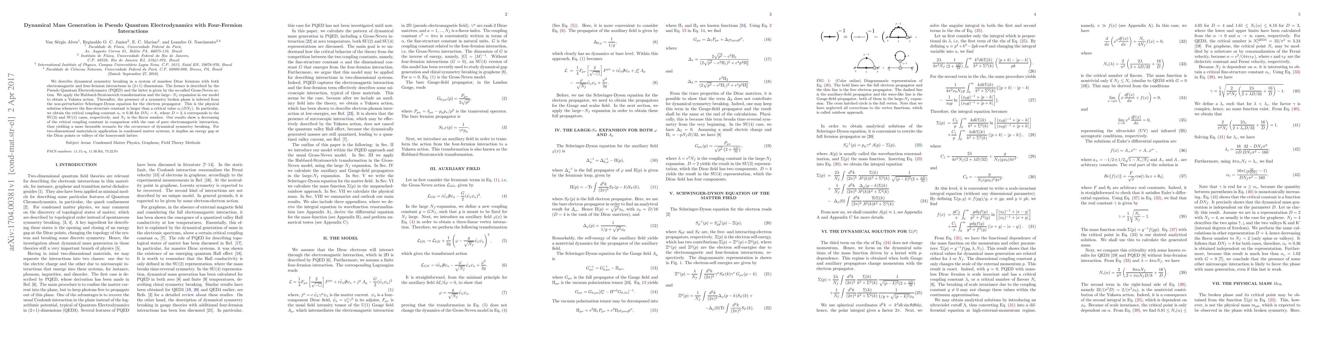 We describe dynamical symmetry breaking in a system of massless Dirac fermions with both electromagnetic and four-fermion interactions in (2+1) dimensions. The former is described by the Pseudo Quantum Electrodynamics (PQED) and the latter is given by the so-called Gross-Neveu action. We apply the Hubbard-Stratonovich transformation and the large$-N_f$ expansion in our model to obtain a Yukawa action. Thereafter, the presence of a symmetry broken phase is inferred from the non-perturbative Schwinger-Dyson equation for the electron propagator. This is the physical solution whenever the fine-structure constant is larger than a critical value $\alpha_c(D N_f)$. In particular, we obtain the critical coupling constant $\alpha_c\approx 0.36$ for $D N_f=8$., where $D=2,4$ corresponds to the SU(2) and SU(4) cases, respectively, and $N_f$ is the flavor number. Our results show a decreasing of the critical coupling constant in comparison with the case of pure electromagnetic interaction, thus yielding a more favorable scenario for the occurrence of dynamical symmetry breaking. For two-dimensional materials,in application in condensed matter systems, it implies an energy gap at the Dirac points or valleys of the honeycomb lattice.