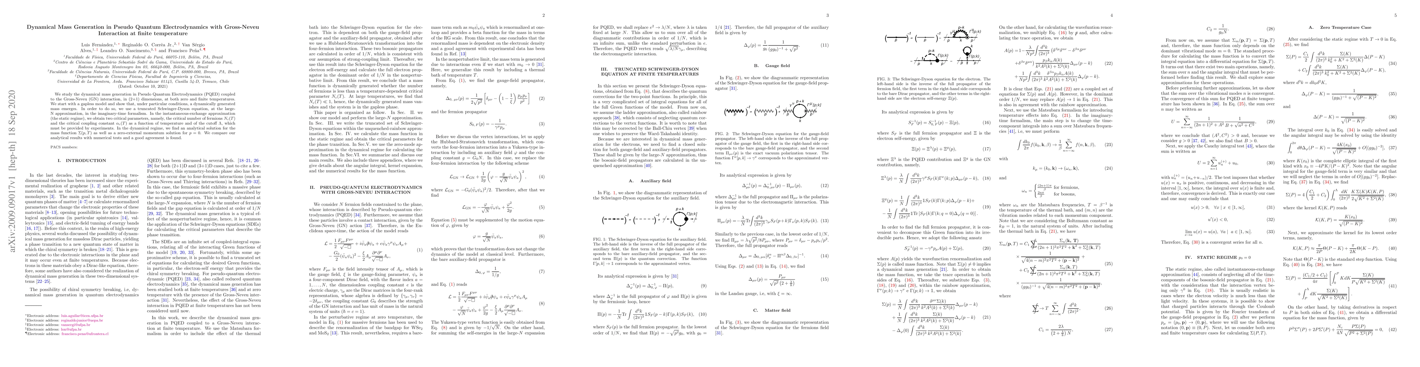 We study the dynamical mass generation in Pseudo Quantum Electrodynamics (PQED) coupled to the Gross-Neveu (GN) interaction, in (2+1) dimensions, at both zero and finite temperatures. We start with a gapless model and show that, under particular conditions, a dynamically generated mass emerges. In order to do so, we use a truncated Schwinger-Dyson equation, at the large-N approximation, in the imaginary-time formalism. In the instantaneous-exchange approximation (the static regime), we obtain two critical parameters, namely, the critical number of fermions $N_c(T)$ and the critical coupling constant $\alpha_c(T)$ as a function of temperature and of the cutoff $\Lambda$, which must be provided by experiments. In the dynamical regime, we find an analytical solution for the mass function $\Sigma(p,T)$ as well as a zero-external momentum solution for $p=0$. We compare our analytical results with numerical tests and a good agreement is found.
