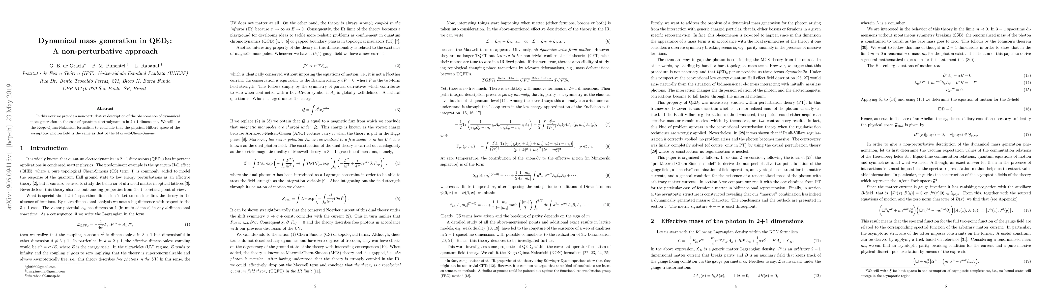 In this work, we provide a non-perturbative description of the phenomenon of dynamical mass generation in the case of quantum electrodynamics in $2+1$ dimensions. We will use the Kugo-Ojima-Nakanishi formalism to conclude that the physical Hilbert space of the asymptotic photon field is the same as that of the Maxwell-Chern-Simons.
