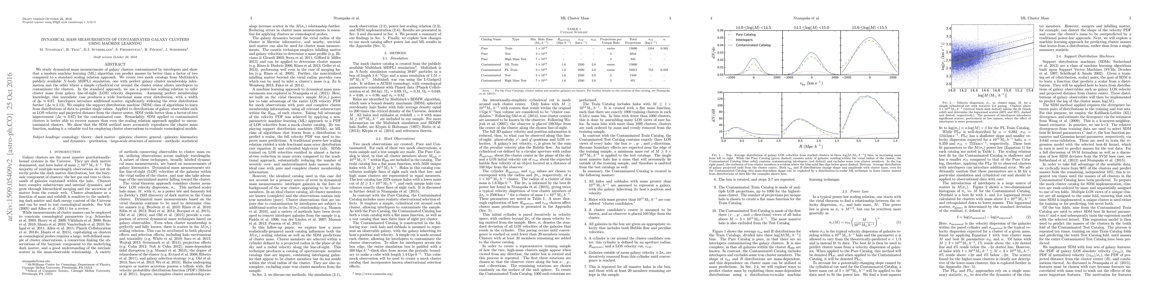 We study dynamical mass measurements of galaxy clusters contaminated by interlopers and show that a modern machine learning (ML) algorithm can predict masses by better than a factor of two compared to a standard scaling relation approach. We create two mock catalogs from Multidark's publicly available $N$-body MDPL1 simulation, one with perfect galaxy cluster membership information and the other where a simple cylindrical cut around the cluster center allows interlopers to contaminate the clusters. In the standard approach, we use a power-law scaling relation to infer cluster mass from galaxy line-of-sight (LOS) velocity dispersion. Assuming perfect membership knowledge, this unrealistic case produces a wide fractional mass error distribution, with a width of $\Delta\epsilon\approx0.87$. Interlopers introduce additional scatter, significantly widening the error distribution further ($\Delta\epsilon\approx2.13$). We employ the support distribution machine (SDM) class of algorithms to learn from distributions of data to predict single values. Applied to distributions of galaxy observables such as LOS velocity and projected distance from the cluster center, SDM yields better than a factor-of-two improvement ($\Delta\epsilon\approx0.67$) for the contaminated case. Remarkably, SDM applied to contaminated clusters is better able to recover masses than even the scaling relation approach applied to uncontaminated clusters. We show that the SDM method more accurately reproduces the cluster mass function, making it a valuable tool for employing cluster observations to evaluate cosmological models.