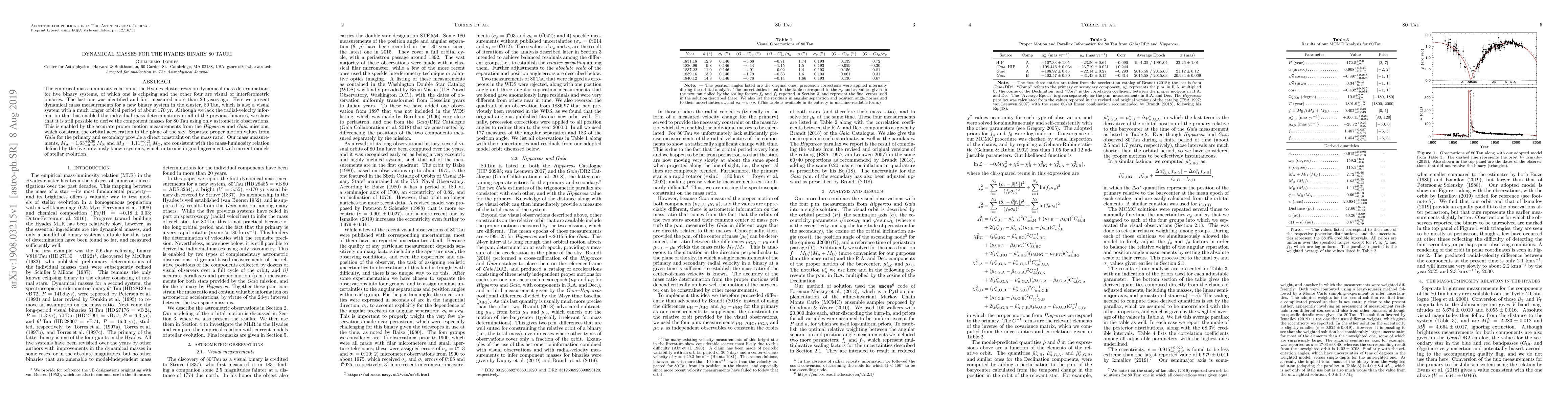 This paper reports dynamical mass measurements for the binary system 80 Tau in the Hyades cluster, using astrometric observations from the Hipparcos and Gaia missions. The derived masses for the components, M(A) = 1.63 (+0.30/-0.13) M(sun) and M(B) = 1.11 (+0.21/-0.14) M(sun), align with the existing mass-luminosity relation for the cluster.