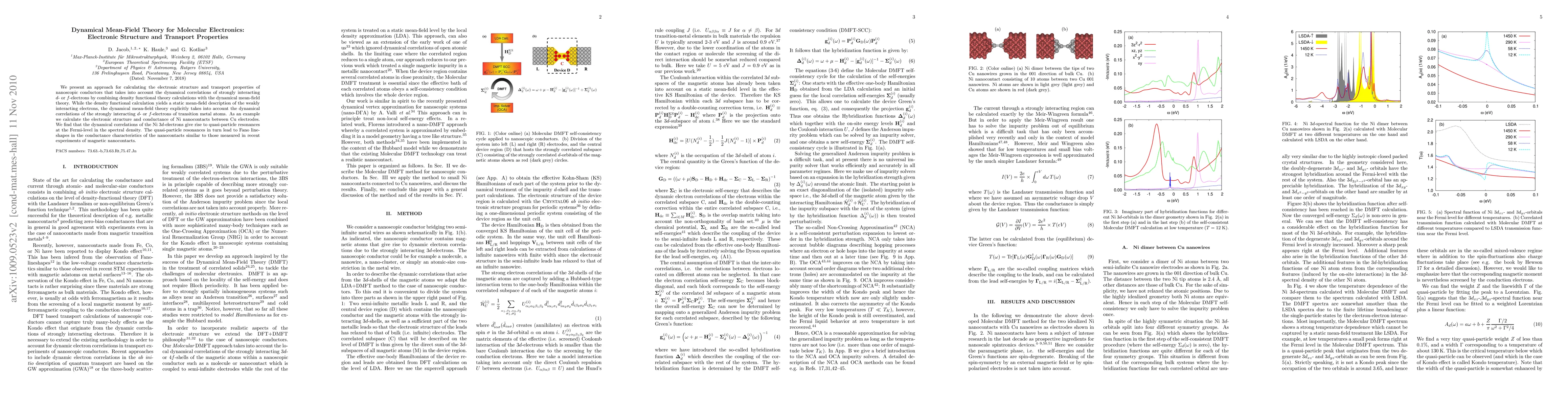 This paper combines density functional theory with dynamical mean-field theory to calculate electronic structure and transport properties in nanoscopic conductors, focusing on strongly interacting d- or f-electrons. The study finds quasi-particle resonances in Ni nanocontacts due to Ni 3d-electron correlations, resulting in Fano lineshapes in conductance, matching recent experimental observations.