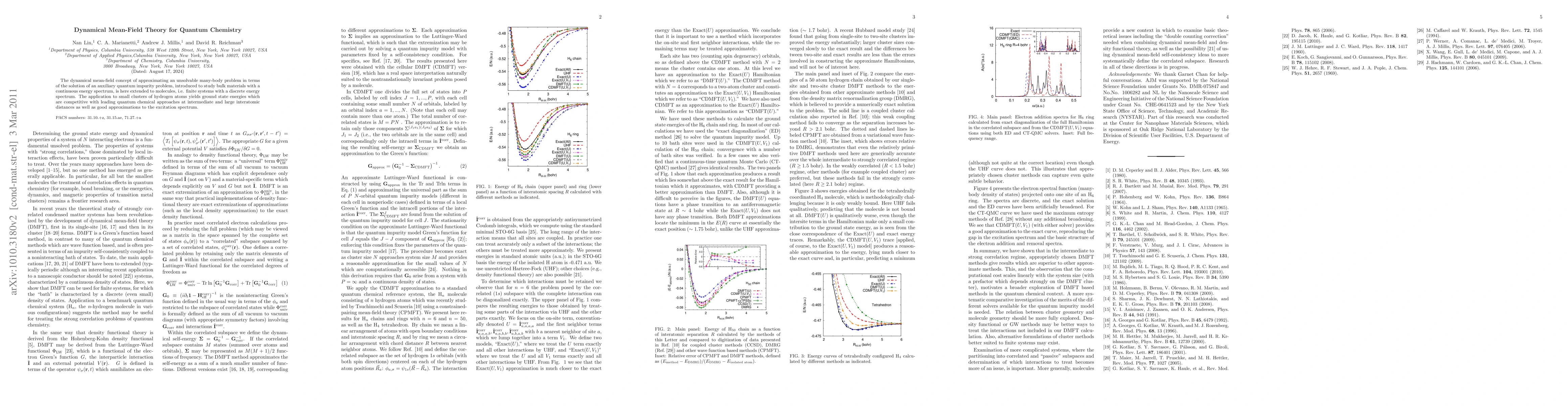 This research extends the dynamical mean-field theory, initially used for bulk materials, to quantum chemistry of molecules, achieving competitive ground state energies and excitation spectrum approximations for small hydrogen clusters.