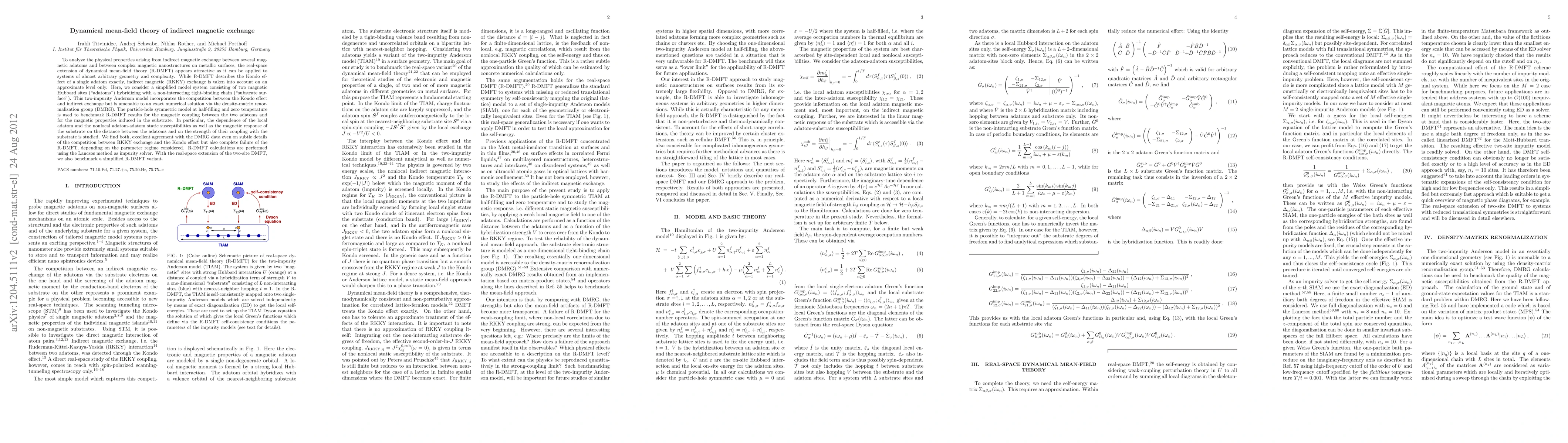 This paper investigates the indirect magnetic exchange between magnetic adatoms on metallic surfaces using the real-space extension of dynamical mean-field theory (R-DMFT). It benchmarks R-DMFT against density-matrix renormalization group (DMRG) results in a simplified two-adatom model, revealing both the strengths and limitations of R-DMFT in capturing the competition between RKKY exchange and the Kondo effect.
