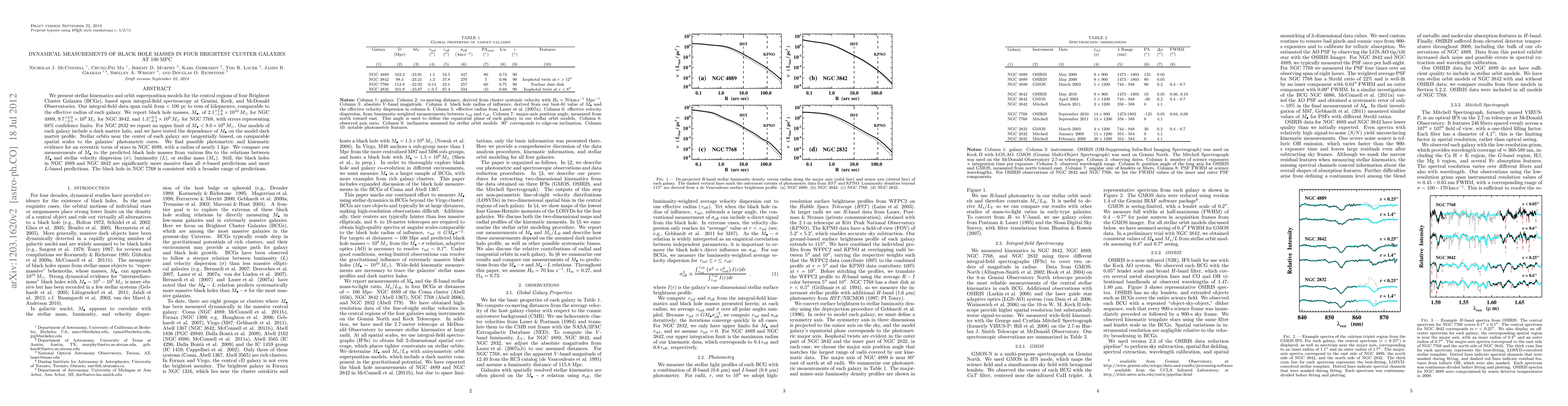 We present stellar kinematics and orbit superposition models for the central regions of four Brightest Cluster Galaxies (BCGs), based upon integral-field spectroscopy at Gemini, Keck, and McDonald Observatories. Our integral-field data span radii from < 100 pc to tens of kpc. We report black hole masses, M_BH, of 2.1 +/- 1.6 x 10^10 M_Sun for NGC 4889, 9.7 + 3.0 - 2.6 x 10^9 M_Sun for NGC 3842, and 1.3 + 0.5 - 0.4 x 10^9 M_Sun for NGC 7768. For NGC 2832 we report an upper limit of M_BH < 9 x 10^9 M_Sun. Stellar orbits near the center of each galaxy are tangentially biased, on comparable spatial scales to the galaxies' photometric cores. We find possible photometric and kinematic evidence for an eccentric torus of stars in NGC 4889, with a radius of nearly 1 kpc. We compare our measurements of M_BH to the predicted black hole masses from various fits to the relations between M_BH and stellar velocity dispersion, luminosity, or stellar mass. The black holes in NGC 4889 and NGC 3842 are significantly more massive than all dispersion-based predictions and most luminosity-based predictions. The black hole in NGC 7768 is consistent with a broader range of predictions.