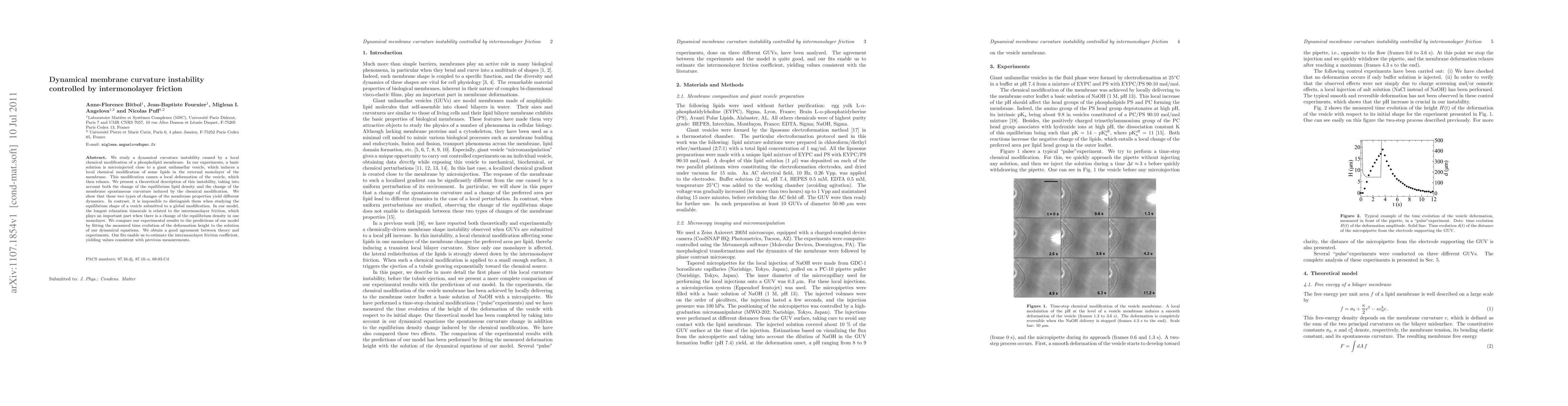 We study a dynamical curvature instability caused by a local chemical modification of a phospholipid membrane. In our experiments, a basic solution is microinjected close to a giant unilamellar vesicle, which induces a local chemical modification of some lipids in the external monolayer of the membrane. This modification causes a local deformation of the vesicle, which then relaxes. We present a theoretical description of this instability, taking into account both the change of the equilibrium lipid density and the change of the spontaneous membrane curvature induced by the chemical modification. We show that these two types of changes of the membrane properties yield different dynamics. In contrast, it is impossible to distinguish them when studying the equilibrium shape of a vesicle subjected to a global modification. In our model, the longest relaxation timescale is related to the intermonolayer friction, which plays an important part when there is a change in the equilibrium density in one monolayer. We compare our experimental results to the predictions of our model by fitting the measured time evolution of the deformation height to the solution of our dynamical equations. We obtain good agreement between theory and experiments. Our fits enable us to estimate the intermonolayer friction coefficient, yielding values that are consistent with previous measurements.