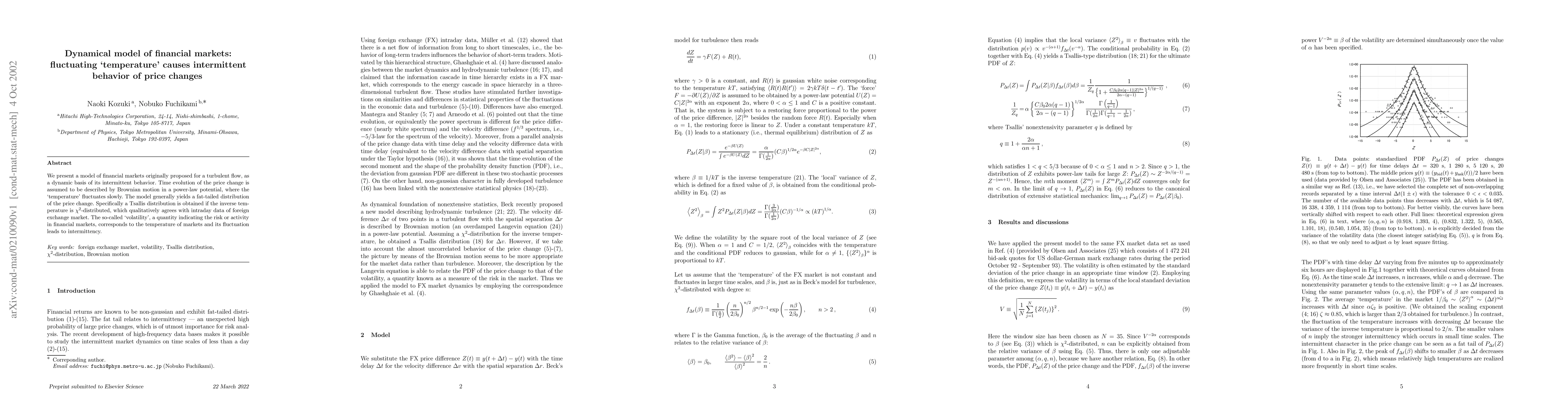 We present a model of financial markets originally proposed for a turbulent flow, as a dynamic basis of its intermittent behavior. Time evolution of the price change is assumed to be described by Brownian motion in a power-law potential, where the `temperature' fluctuates slowly. The model generally yields a fat-tailed distribution of the price change. Specifically a Tsallis distribution is obtained if the inverse temperature is $\chi^{2}$-distributed, which qualitatively agrees with intraday data of foreign exchange market. The so-called `volatility', a quantity indicating the risk or activity in financial markets, corresponds to the temperature of markets and its fluctuation leads to intermittency.