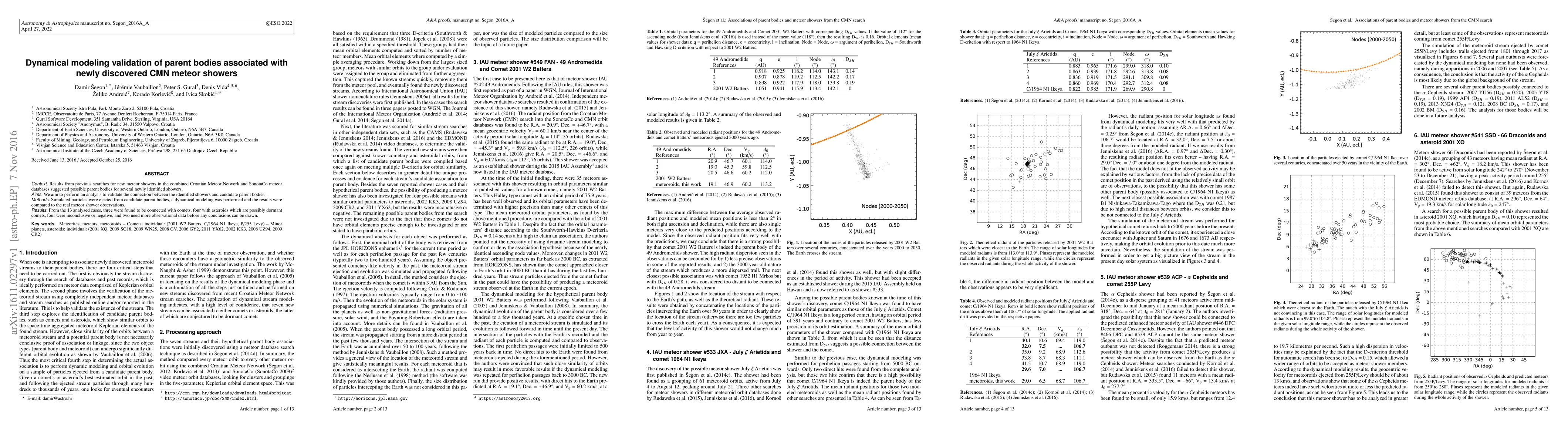 Context: Results from previous searches for new meteor showers in the combined Croatian Meteor Network and SonotaCo meteor databases suggested possible parent bodies for several newly identified showers. Aims: We aim to perform an analysis to validate the connection between the identified showers and candidate parent bodies. Methods: Simulated particles were ejected from candidate parent bodies, a dynamical modeling was performed and the results were compared to the real meteor shower observations. Results: From the 13 analysed cases, three were found to be connected with comets, four with asteroids which are possibly dormant comets, four were inconclusive or negative, and two need more observational data before any conclusions can be drawn.