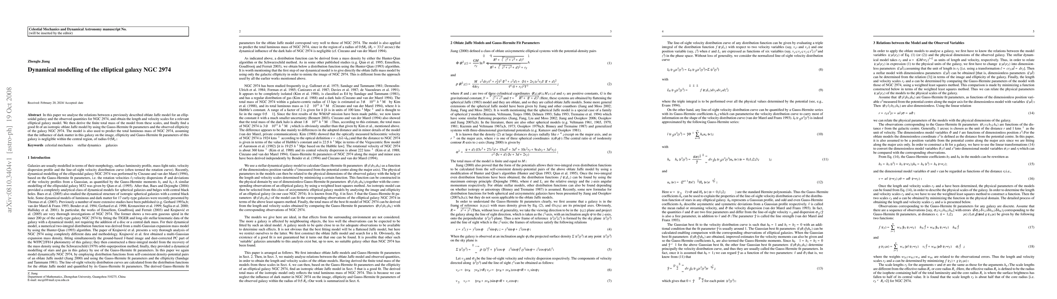 In this paper we analyse the relations between a previously described oblate Jaffe model for an ellipsoidal galaxy and the observed quantities for NGC 2974, and obtain the length and velocity scales for a relevant elliptical galaxy model. We then derive the finite total mass of the model from these scales, and finally find a good fit of an isotropic oblate Jaffe model by using the Gauss-Hermite fit parameters and the observed ellipticity of the galaxy NGC 2974. The model is also used to predict the total luminous mass of NGC 2974, assuming that the influence of dark matter in this galaxy on the image, ellipticity and Gauss-Hermite fit parameters of this galaxy is negligible within the central region, of radius $0.5R_{\rm e}.$