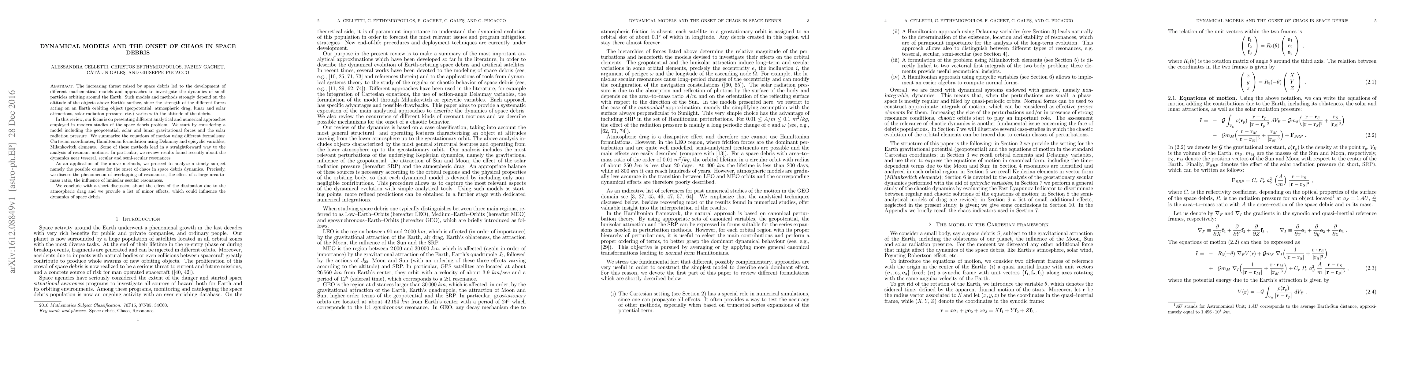 This paper reviews analytical and numerical models for studying space debris dynamics, focusing on the onset of chaos due to various forces and resonances. It discusses the equations of motion in different formulations and analyzes the effects of overlapping resonances and lunisolar influences on debris chaos.