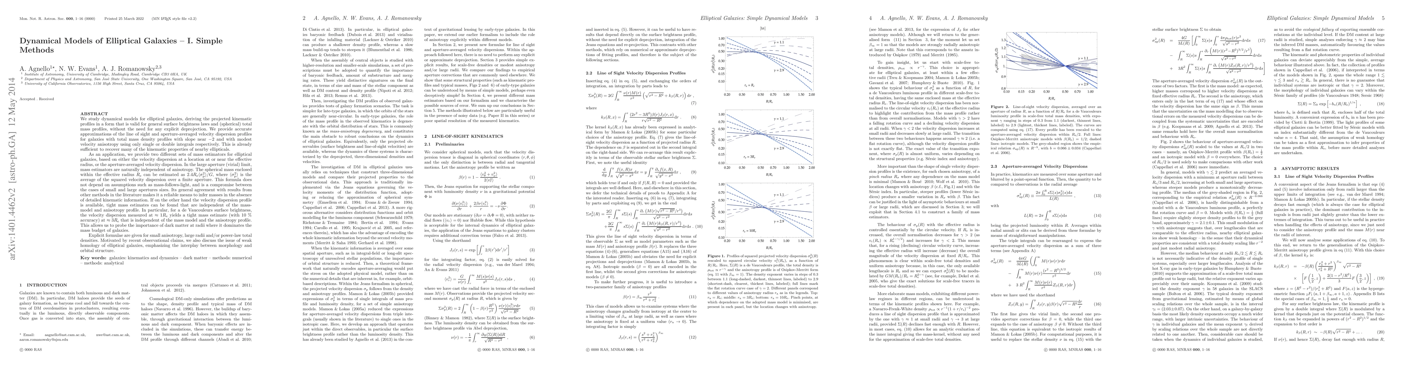 This paper develops dynamical models for elliptical galaxies, showing that simple methods can derive kinematic profiles without deprojection. It provides mass estimators based on velocity dispersion, offering a reliable mass estimation formula independent of assumptions like mass-follows-light, and discusses the relationship between morphology and orbital structure.