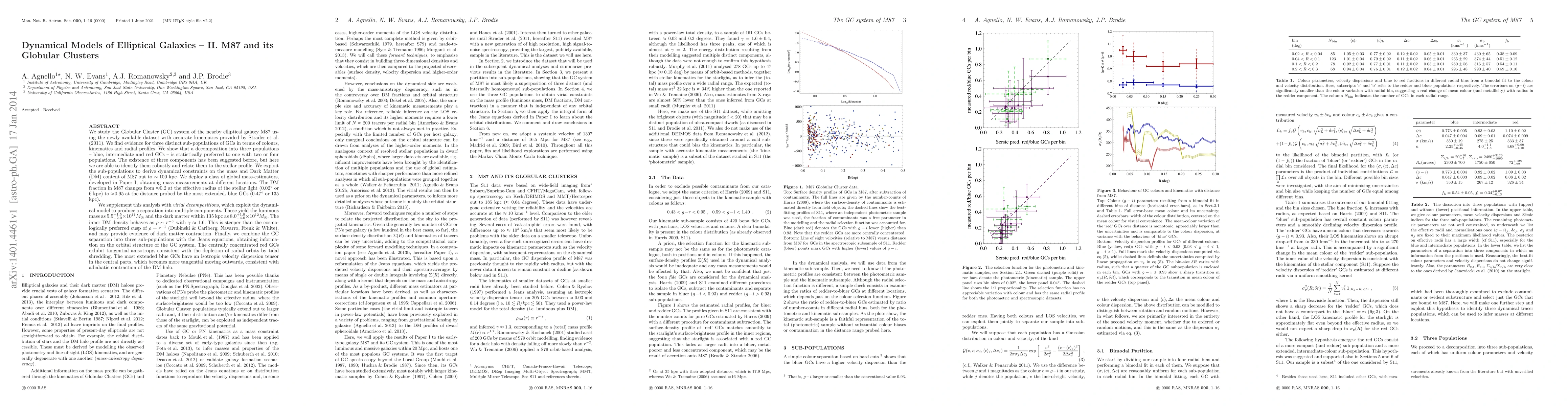 We study the Globular Cluster (GC) system of the nearby elliptical galaxy M87 using the newly available dataset with accurate kinematics (Strader et al.2011). We find evidence for three distinct sub-populations of GCs in terms of colours, kinematics and radial profiles. We show that a decomposition into three populations (blue, intermediate and red GCs) is statistically preferred to one with two or four populations, and relate them to the stellar profile. We exploit the sub-populations to derive dynamical constraints on the mass and Dark Matter (DM) content of M87 out to $\sim100$ kpc. We use a class of global mass-estimators (from Paper I), obtaining mass measurements at different locations. M87's DM fraction changes from $\approx$0.2 at the starlight's effective radius (6 kpc) to $\approx$0.95 at the distance probed by the most extended, blue GCs (135 kpc). We supplement this with \textit{virial decompositions}, exploiting the dynamical model to produce a separation into multiple components. These yield the luminous mass as $5.5^{+1.5}_{-2.0}\times 10^{11}M_\odot$ and the DM within 135 kpc as $8.0^{+1.0}_{-4.0}\times 10^{12}M_\odot.$ The inner DM density behaves as $\rho \sim r^{-\gamma}$ with $\gamma\approx 1.6$. This is steeper than the cosmologically preferred cusp $\rho \sim r^{-1},$ providing evidence of DM contraction. Finally, we combine the GC separation into three sub-populations and the Jeans equations, obtaining information on the orbits of the GC system. The centrally concentrated red GCs exhibit tangential anisotropy, consistent with radial-orbit depletion by tidal shredding. The most extended blue GCs have an isotropic velocity dispersion tensor in the central parts, which becomes more tangential moving outwards, consistent with adiabatic contraction of the DM halo.