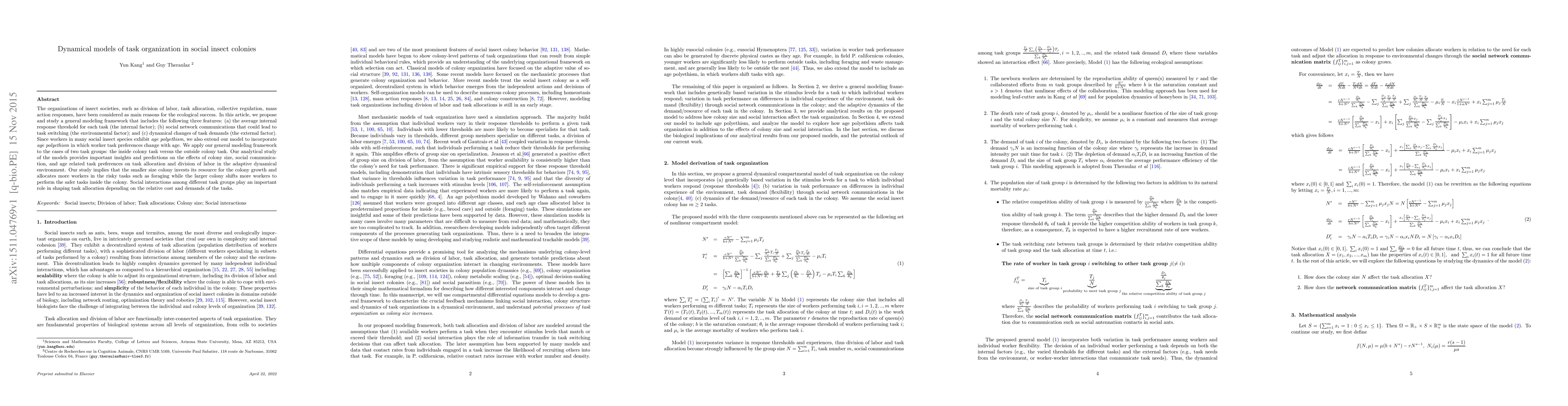 This paper proposes a dynamical modeling framework to study task organization in social insect colonies, incorporating internal response thresholds, social network communications, and external task demands. The model also considers age polyethism, revealing that smaller colonies prioritize risky tasks while larger colonies focus on safer internal tasks, influenced by social interactions and task demands.