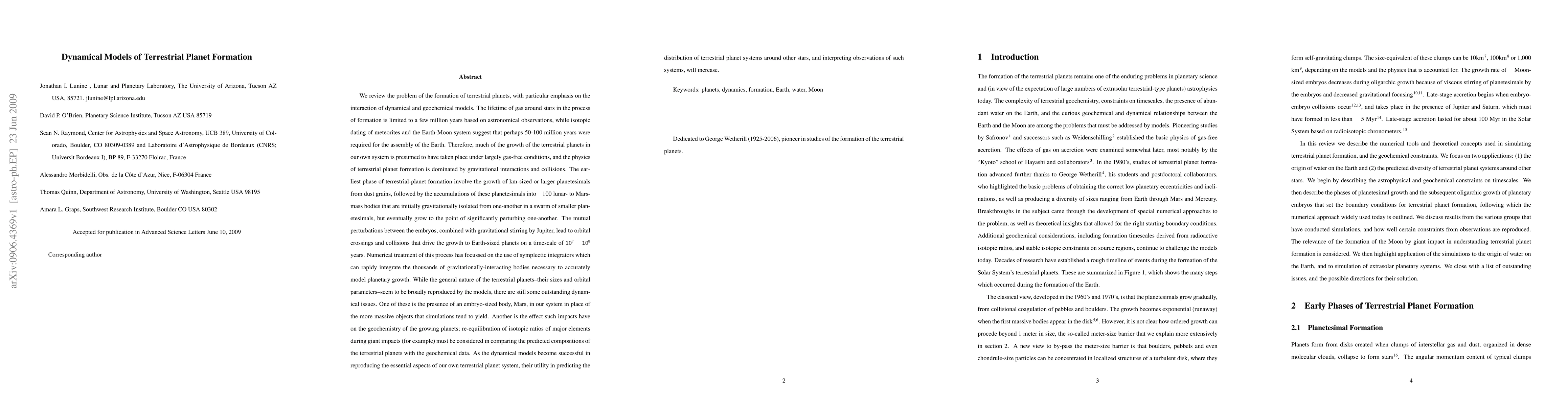 This paper reviews terrestrial planet formation, focusing on the interplay between dynamical and geochemical models. It highlights the rapid gas dissipation around forming stars and the longer timescales inferred from isotopic dating, suggesting that terrestrial planet growth largely occurs in gas-free conditions dominated by gravitational interactions and collisions. Numerical simulations using symplectic integrators reproduce the general characteristics of terrestrial planets but struggle to explain the presence of Mars-sized bodies.
