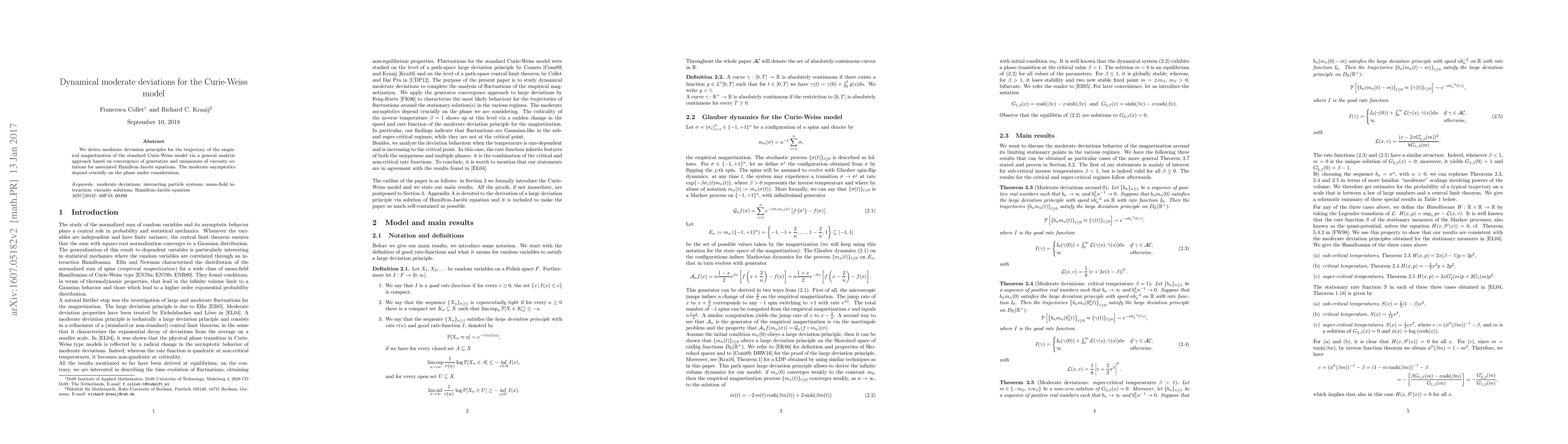 We derive moderate deviation principles for the trajectory of the empirical magnetization of the standard Curie-Weiss model via a general analytic approach based on convergence of generators and uniqueness of viscosity solutions for associated Hamilton-Jacobi equations. The moderate asymptotics depend crucially on the phase under consideration.