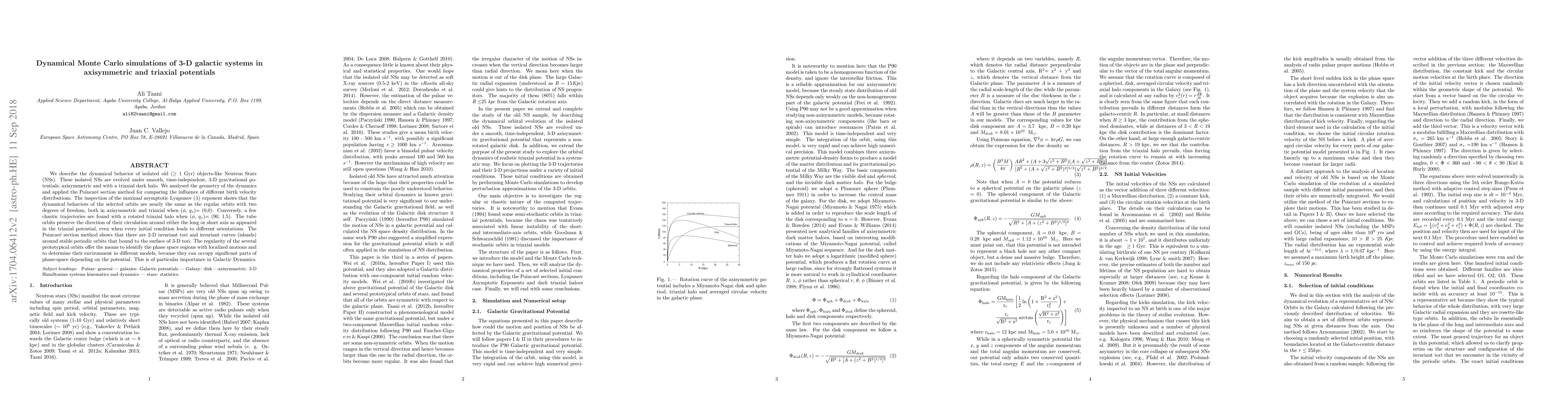 We describe the dynamical behavior of isolated old (> 1 G yr) objects-like Neutron Stars (NSs). These isolated NSs are evolved under smooth, time-independent, 3-D gravitational potentials, axisymmetric and with a triaxial dark halo. We analysed the geometry of the dynamics and applied the Poincare section method for comparing the influence of different birth velocity distributions. The inspection of the maximal asymptotic Lyapunov (Lambda) exponent shows that the dynamical behaviors of the selected orbits are nearly the same as the regular orbits with two degrees of freedom, both in axisymmetric and triaxial when (phi, q_z)= (0,0). Conversely, a few chaotic trajectories are found with a rotated triaxial halo when (phi, q_z)= (90, 1.5). The tube orbits preserve the direction of their circulation around either the long or short axis as appeared in the triaxial potential, even when every initial condition leads to different orientations. The Poincare section method shows that there are 2-D invariant tori and invariant curves (islands) around stable periodic orbits that bound to the surface of 3-D tori. The regularity of the several prototypical orbits offer the means to identify the phase space regions with localized motions and to determine their environment in different models, because they can occupy significant parts of phase-space depending on the potential. This is of particular importance in Galactic Dynamics.