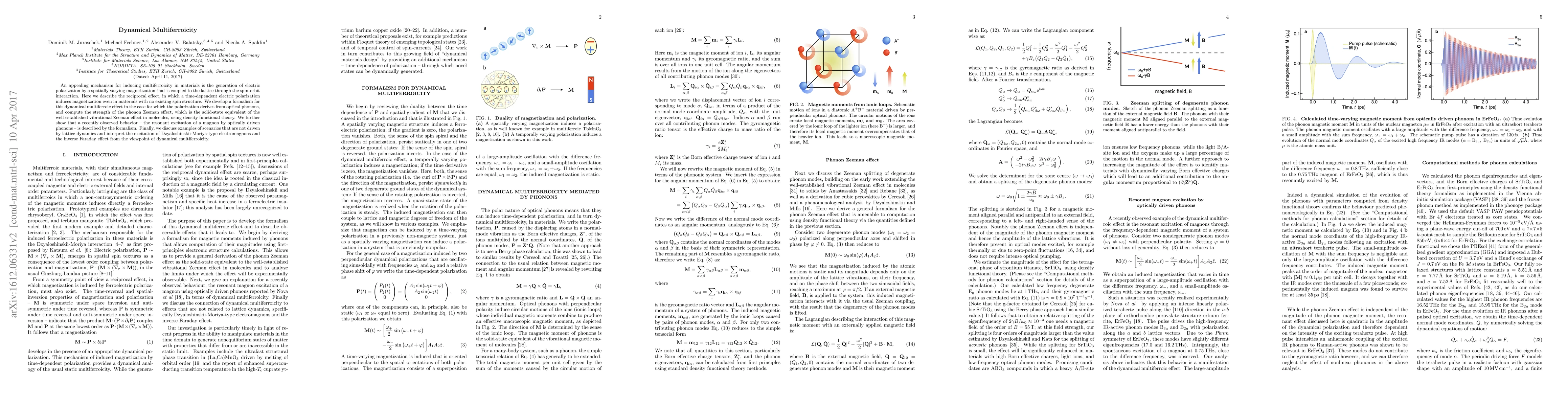 This paper explores a novel dynamical mechanism for inducing multiferroicity where time-dependent electric polarization generates magnetization in materials lacking an inherent spin structure. The authors develop a theoretical framework for this effect, particularly when driven by optical phonons, and use density functional theory to quantify the phonon Zeeman effect.