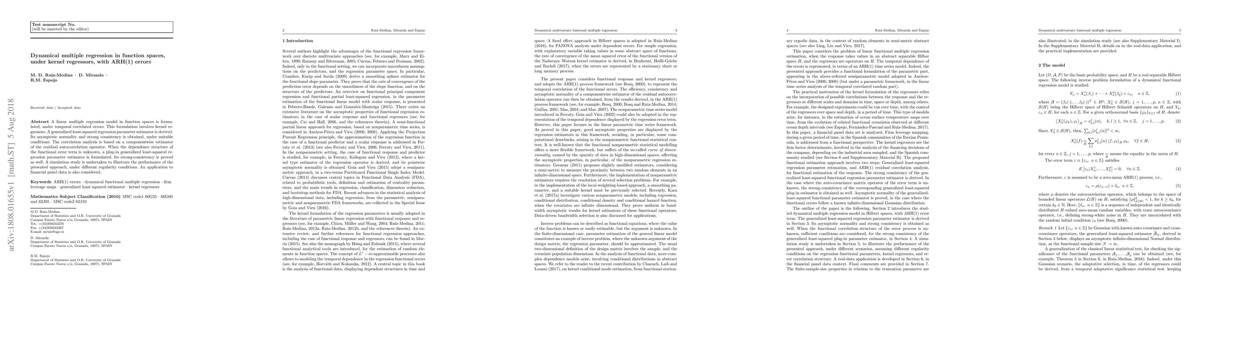 This paper formulates a linear multiple regression model in function spaces with kernel regressors and temporal correlated ARH(1) errors. It derives a generalized least-squared estimator, proving its asymptotic normality and strong consistency, and applies it to financial panel data.