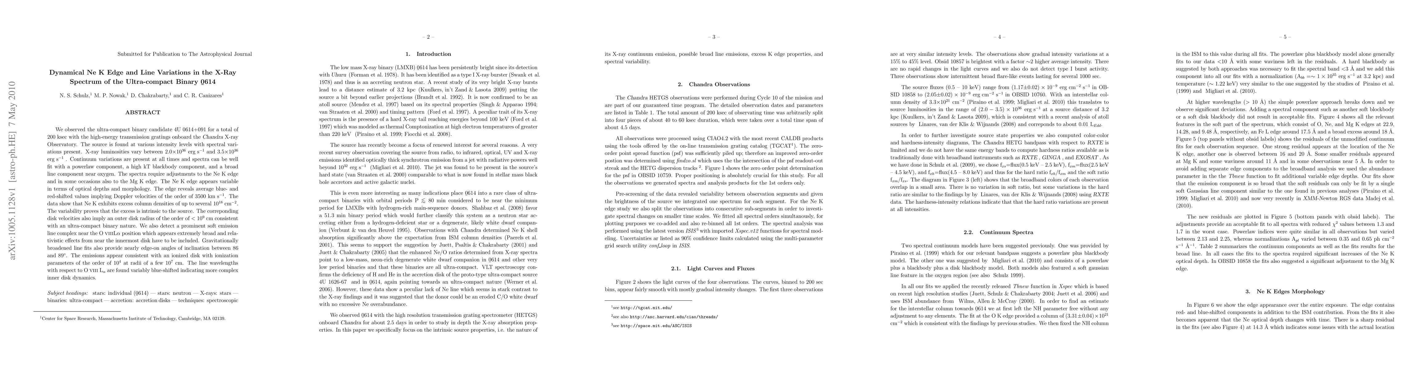 We observed the ultra-compact binary candidate 4U 0614+091 for a total of 200 ksec with the high-energy transmission gratings onboard the \chandra X-ray Observatory. The source is found at various intensity levels with spectral variations present. X-ray luminosities vary between 2.0$\times10^{36}$ \ergsec and 3.5$\times10^{36}$ \ergsec. Continuum variations are present at all times and spectra can be well fit with a powerlaw component, a high kT blackbody component, and a broad line component near oxygen. The spectra require adjustments to the Ne K edge and in some occasions also to the Mg K edge. The Ne K edge appears variable in terms of optical depths and morphology. The edge reveals average blue- and red-shifted values implying Doppler velocities of the order of 3500 \kms. The data show that Ne K exhibits excess column densities of up to several 10$^{18}$ cm$^{-2}$. The variability proves that the excess is intrinsic to the source. The correponding disk velocities also imply an outer disk radius of the order of $< 10^9$ cm consistent with an ultra-compact binary nature. We also detect a prominent soft emission line complex near the \oviii L$\alpha$ position which appears extremely broad and relativistic effects from near the innermost disk have to be included. Gravitationally broadened line fits also provide nearly edge-on angles of inclination between 86 and 89$^{\circ}$. The emissions appear consistent with an ionized disk with ionization parameters of the order of 10$^4$ at radii of a few 10$^7$ cm. The line wavelengths with respect to \oviiia\ are found variably blue-shifted indicating more complex inner disk dynamics.