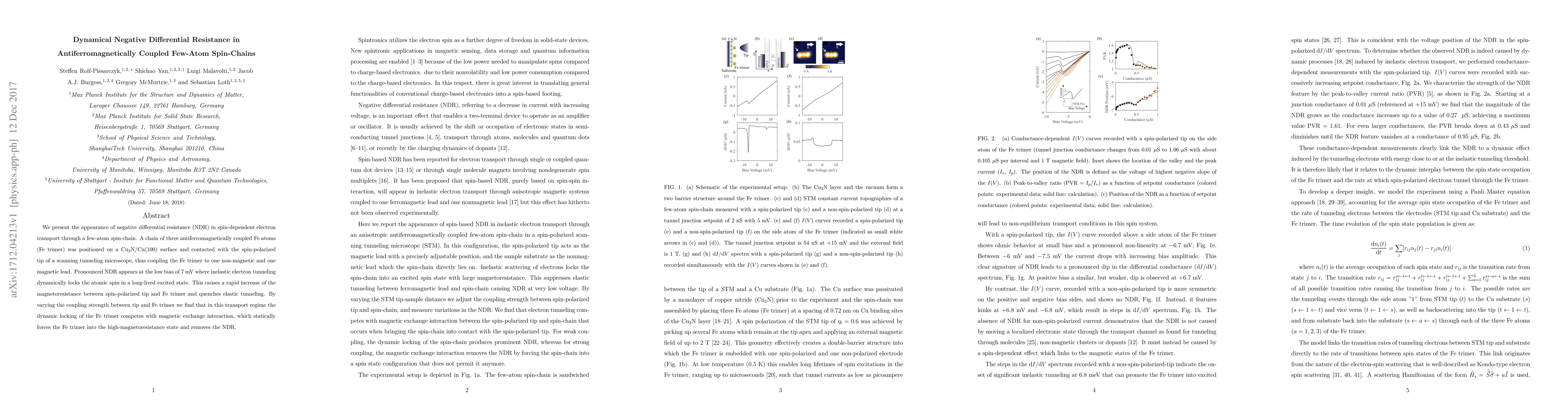 This paper investigates negative differential resistance (NDR) in spin-dependent electron transport through a few-atom spin-chain, specifically a Fe trimer on a Cu2N/Cu(100) surface. At low bias, NDR emerges due to dynamic locking of the atomic spin in an excited state, which enhances magnetoresistance and suppresses elastic tunneling.