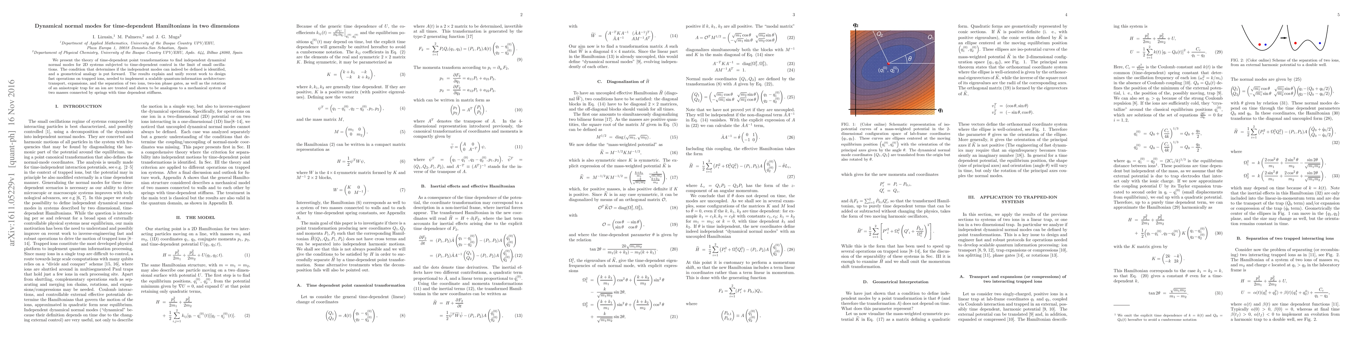We present the theory of time-dependent point transformations to find independent dynamical normal modes for 2D systems subjected to time-dependent control in the limit of small oscillations. The condition that determines if the independent modes can indeed be defined is identified, and a geometrical analogy is put forward. The results explain and unify recent work to design fast operations on trapped ions, needed to implement a scalable quantum-information architecture: transport, expansions, and the separation of two ions, two-ion phase gates, as well as the rotation of an anisotropic trap for an ion are treated and shown to be analogous to a mechanical system of two masses connected by springs with time dependent stiffness.